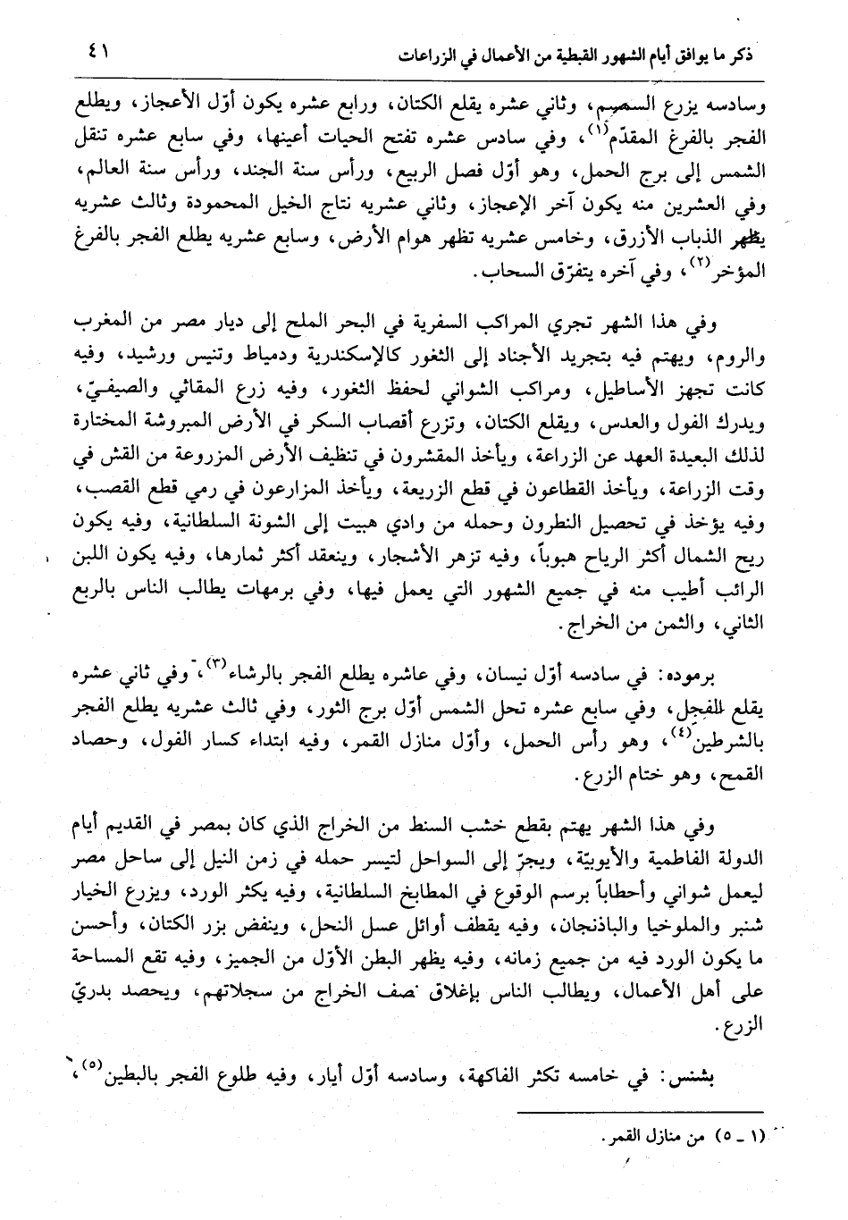 وفي هذا الشهر يهتم بقطع خشب السنط من الخراج الذي كان بمصر في القديم أيام الدولة الفاطمية والأيوبيّة، ويجرّ إلى السواحل لتيسر حمله في زمن النيل إلى ساحل مصر ليعمل شواني وأحطابا برسم الوقوع في المطابخ السلطانية، وفيه يكثر الورد، ويزرع الخيار شنبر والملوخيا والباذنجان، وفيه يقطف أوائل عسل النحل، وينفض بزر الكتان، وأحسن ما يكون الورد فيه من جميع زمانه، وفيه يظهر البطن الأوّل من الجميز، وفيه تقع المساحة على أهل الأعمال، ويطالب الناس بإغلاق نصف الخراج من سجلاتهم، ويحصد بدريّ الزرع.