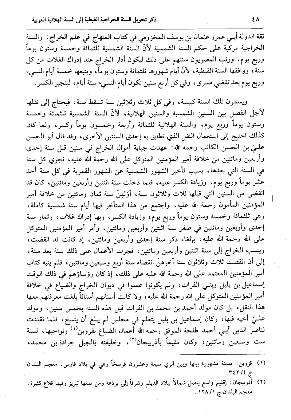 ويسمون تلك السنة كبيسة، وفي كل ثلاث وثلاثين سنة تسقط سنة، فيحتاج إلى نقلها لأجل الفصل بين السنين الشمسية والسنين الهلالية، لأنّ السنة الشمسية ثلثمائة وخمسة وستون يوما وربع يوم، والسنة الهلالية ثلثمائة وأربعة وخمسون يوما وكسر، ولما كان كذلك احتيج إلى استعمال النقل الذي تطابق به إحدى السنتين الأخرى، وقد قال أبو الحسن عليّ بن الحسن الكاتب رحمه الله: عهدت جباية أموال الخراج في سنين قبل سنة إحدى وأربعين ومائتين من خلافة أمير المؤمنين المتوكل على الله رحمة الله عليه، تجري كل سنة في السنة التي بعدها، بسبب تأخير الشهور الشمسية عن الشهور القمرية في كل سنة أحد عشر يوما وربع يوم، وزيادة الكسر عليه، فلما دخلت سنة اثنتين وأربعين ومائتين، كان قد انقضى من السنين التي قبلها ثلاث وثلاثون سنة، أوّلهنّ سنة ثمان ومائتين من خلافة أمير المؤمنين المأمون رحمة الله عليه، واجتمع من هذا المتأخر فيها أيام سنة شمسية كاملة، وهي ثلثمائة وخمسة وستون يوما وربع يوم، وزيادة الكسر، وبها إدراك غلات، وثمار سنة إحدى وأربعين ومائتين في صفر سنة اثنتين وأربعين ومائتين، وأمر أمير المؤمنين المتوكل على الله رحمة الله عليه، بإلغاء ذكر سنة إحدى وأربعين ومائتين، إذ كانت قد انقضت، وينسب الخراج إلى سنة اثنتين وأربعين ومائتين، فجرت الأعمال على ذلك سنة بعد سنة، إلى أن انقضت ثلاث وثلاثون سنة آخرهنّ انقضاء سنة أربع وسبعين ومائتين، فلم ينبه كتاب أمير المؤمنين المعتمد على الله رحمة الله عليه على ذلك، إذ كان رؤساؤهم في ذلك الوقت إسماعيل بن بلبل وبني الفرات، ولم يكونوا عملوا في ديوان الخراج والضياع في خلافة أمير المؤمنين المتوكل على الله رحمة الله عليه ولا كانت أسنانهم أسنانا بلغت معرفتهم معها هذا النقل، بل كان مولد أحمد بن محمد بن الفرات قبل هذه السنة بخمس سنين، ومولد عليّ أخيه فيها، وكان إسماعيل بن بلبل يتعلم في مجلس لم يبلغ أن ينسخ، فلما تقلدت لناصر الدين أبي أحمد طلحة الموفق رحمه الله أعمال الضياع بقزوين «1» ونواحيها، لسنة ست وسبعين ومائتين، وكان مقيما بأذربيجان «2» ، وخليفته بالجبل جرادة بن محمد،