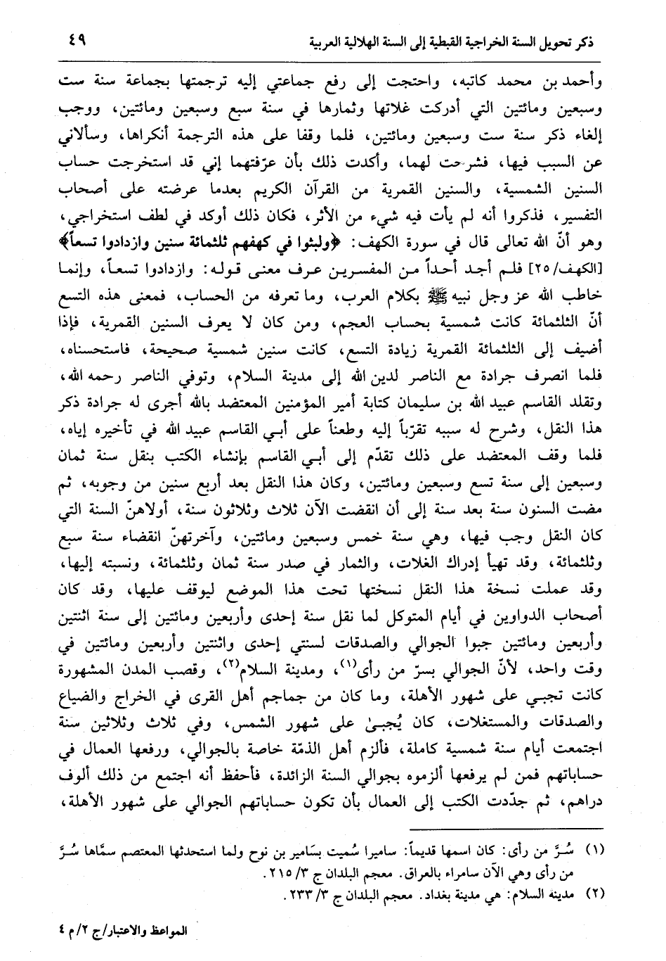 [الكهف/ 25] فلم أجد أحدا من المفسرين عرف معنى قوله: وازدادوا تسعا، وإنما خاطب الله عز وجل نبيه صلّى الله عليه وسلّم بكلام العرب، وما تعرفه من الحساب، فمعنى هذه التسع أنّ الثلاثمائة كانت شمسية بحساب العجم، ومن كان لا يعرف السنين القمرية، فإذا أضيف إلى الثلاثمائة القمرية زيادة التسع، كانت سنين شمسية صحيحة، فاستحسناه، فلما انصرف جرادة مع الناصر لدين الله إلى مدينة السلام، وتوفي الناصر رحمه الله، وتقلد القاسم عبيد الله بن سليمان كتابة أمير المؤمنين المعتضد بالله أجرى له جرادة ذكر هذا النقل، وشرح له سببه تقرّبا إليه وطعنا على أبي القاسم عبيد الله في تأخيره إياه، فلما وقف المعتضد على ذلك تقدّم إلى أبي القاسم بإنشاء الكتب بنقل سنة ثمان وسبعين إلى سنة تسع وسبعين ومائتين، وكان هذا النقل بعد أربع سنين من وجوبه، ثم مضت السنون سنة بعد سنة إلى أن انقضت الآن ثلاث وثلاثون سنة، أولاهنّ السنة التي كان النقل وجب فيها، وهي سنة خمس وسبعين ومائتين، وآخرتهنّ انقضاء سنة سبع وثلثمائة، وقد تهيأ إدراك الغلات، والثمار في صدر سنة ثمان وثلثمائة، ونسبته إليها، وقد عملت نسخة هذا النقل نسختها تحت هذا الموضع ليوقف عليها، وقد كان أصحاب الدواوين في أيام المتوكل لما نقل سنة إحدى وأربعين ومائتين إلى سنة اثنتين وأربعين ومائتين جبوا الجوالي والصدقات لسنتي إحدى واثنتين وأربعين ومائتين في وقت واحد، لأنّ الجوالي بسرّمن رأى «1» ، ومدينة السلام «2» ، وقصب المدن المشهورة كانت تجبي على شهور الأهلة، وما كان من جماجم أهل القرى في الخراج والضياع والصدقات والمستغلات، كان يجبى على شهور الشمس، وفي ثلاث وثلاثين سنة اجتمعت أيام سنة شمسية كاملة، فألزم أهل الذمّة خاصة بالجوالي، ورفعها العمال في حساباتهم فمن لم يرفعها ألزموه بجوالي السنة الزائدة، فأحفظ أنه اجتمع من ذلك ألوف دراهم، ثم جدّدت الكتب إلى العمال بأن تكون حساباتهم الجوالي على شهور الأهلة،