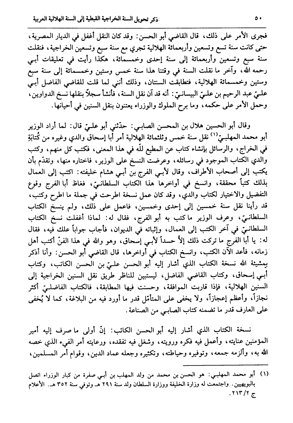 وقال أبو الحسين هلال بن المحسن الصابي: حدّثني أبو عليّ قال: لما أراد الوزير أبو محمد المهلبيّ «1» نقل سنة خمس وثلثمائة الهلالية أمر أبا إسحاق والدي وغيره من كتابة في الخراج، والرسائل بإنشاء كتاب عن المطيع لله في هذا المعنى، فكتب كل منهم، وكتب والدي الكتاب الموجود في رسائله، وعرضت النسخ على الوزير، فاختاره منها، وتقدّم بأن يكتب إلى أصحاب الأطراف، وقال لأبي الفرج بن أبي هشام خليفته: اكتب إلى العمال بذلك كتبا محققه، وانسخ في أواخرها هذا الكتاب السلطانيّ، فغاظ أبا الفرج وقوع التفضيل والاختيار لكتاب والدي، وقد كان عمل نسخة اطرحت في جملة ما اطرح وكتب، قد رأينا نقل سنة خمسين إلى إحدى وخمسين، فاعمل على ذلك، ولم ينسخ الكتاب السلطانيّ، وعرف الوزير ما كتب به أبو الفرج، فقال له: لماذا أغفلت نسخ الكتاب السلطانيّ في آخر الكتب إلى العمال، وإثباته في الديوان، فأجاب جوابا علك فيه، فقال له: يا أبا الفرج ما تركت ذلك إلّا حسدا لأبي إسحاق، وهو والله في هذا الفنّ أكتب أهل زمانه، فأعد الآن الكتب، وانسخ الكتاب في أواخرها، قال القاضي أبو الحسن: وأنا أذكر بمشيئة الله نسخة الكتاب الذي أشار إليه أبو الحسن عليّ بن الحسن الكاتب، وكتاب أبي إسحاق، وكتاب القاضي الفاضل، ليستبين للناظر طريق نقل السنين الخراجية إلى السنين الهلالية، فإذا قاربت الموافقة، وحسنت فيها المطابقة، فالكتاب الفاضليّ أكثر نجازا، وأعظم إعجازا، ولا يخفى على المتأمّل قدر ما أورد فيه من البلاغة، كما لا يخفى على العارف قدر ما تضمنه كتاب الصابي من الصناعة.