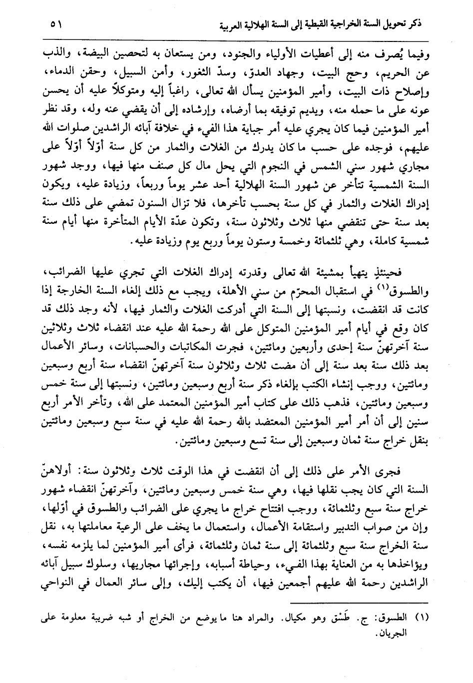 وفيما يصرف منه إلى أعطيات الأولياء والجنود، ومن يستعان به لتحصين البيضة، والذب عن الحريم، وحج البيت، وجهاد العدوّ، وسدّ الثغور، وأمن السبيل، وحقن الدماء، وإصلاح ذات البيت، وأمير المؤمنين يسأل الله تعالى، راغبا إليه ومتوكلا عليه أن يحسن عونه على ما حمله منه، ويديم توفيقه بما أرضاه، وإرشاده إلى أن يقضي عنه وله، وقد نظر أمير المؤمنين فيما كان يجري عليه أمر جباية هذا الفيء في خلافة آبائه الراشدين صلوات الله عليهم، فوجده على حسب ما كان يدرك من الغلات والثمار من كل سنة أوّلا أوّلا على مجاري شهور سني الشمس في النجوم التي يحل مال كل صنف منها فيها، ووجد شهور السنة الشمسية تتأخر عن شهور السنة الهلالية أحد عشر يوما وربعا، وزيادة عليه، ويكون إدراك الغلات والثمار في كل سنة بحسب تأخرها، فلا تزال السنون تمضي على ذلك سنة بعد سنة حتى تنقضي منها ثلاث وثلاثون سنة، وتكون عدّة الأيام المتأخرة منها أيام سنة شمسية كاملة، وهي ثلثمائة وخمسة وستون يوما وربع يوم وزيادة عليه.