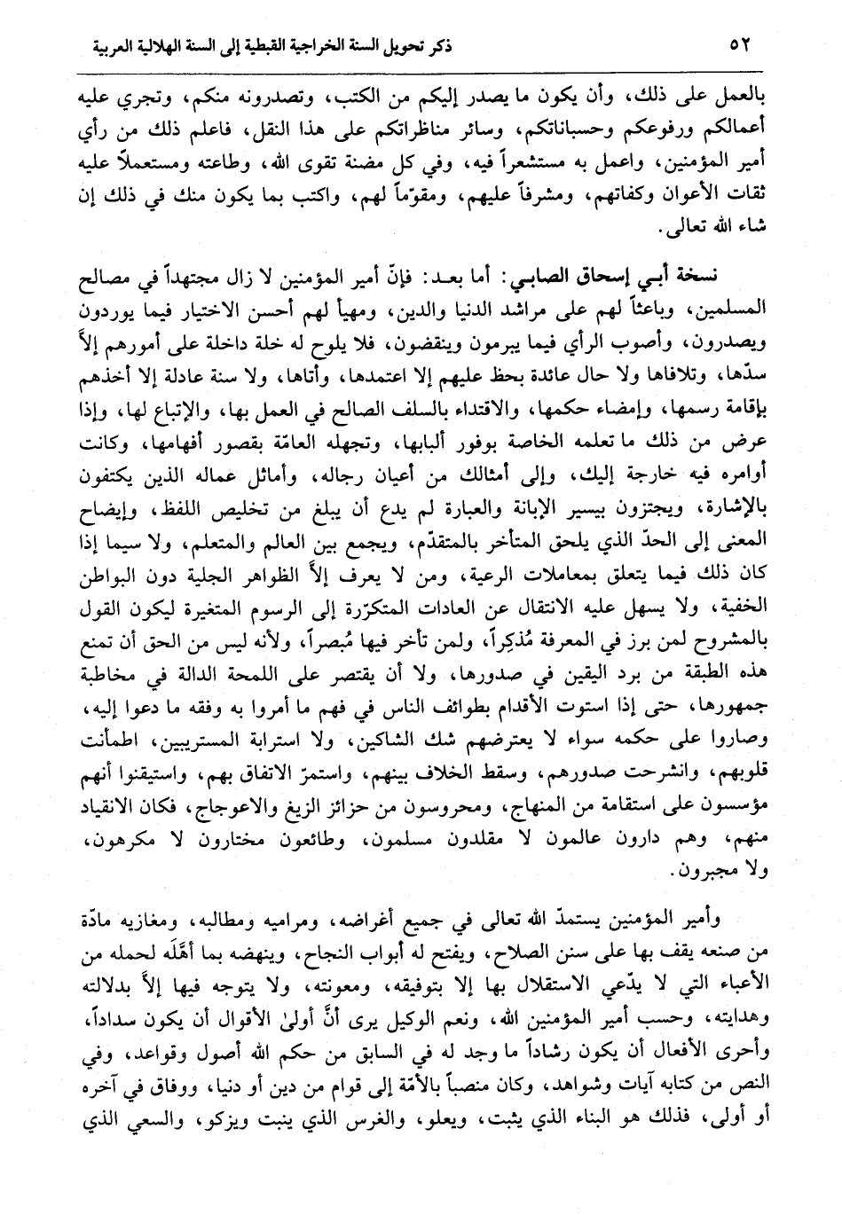 نسخة أبي إسحاق الصابي: أما بعد: فإنّ أمير المؤمنين لا زال مجتهدا في مصالح المسلمين، وباعثا لهم على مراشد الدنيا والدين، ومهيأ لهم أحسن الاختيار فيما يوردون ويصدرون، وأصوب الرأي فيما يبرمون وينقضون، فلا يلوح له خلة داخلة على أمورهم إلّا سدّها، وتلافاها ولا حال عائدة بحظ عليهم إلا اعتمدها، وأتاها، ولا سنة عادلة إلا أخذهم بإقامة رسمها، وإمضاء حكمها، والاقتداء بالسلف الصالح في العمل بها، والإتباع لها، وإذا عرض من ذلك ما تعلمه الخاصة بوفور ألبابها، وتجهله العامّة بقصور أفهامها، وكانت أوامره فيه خارجة إليك، وإلى أمثالك من أعيان رجاله، وأماثل عماله الذين يكتفون بالإشارة، ويجتزون بيسير الإبانة والعبارة لم يدع أن يبلغ من تخليص اللفظ، وإيضاح المعنى إلى الحدّ الذي يلحق المتأخر بالمتقدّم، ويجمع بين العالم والمتعلم، ولا سيما إذا كان ذلك فيما يتعلق بمعاملات الرعية، ومن لا يعرف إلّا الظواهر الجلية دون البواطن الخفية، ولا يسهل عليه الانتقال عن العادات المتكرّرة إلى الرسوم المتغيرة ليكون القول بالمشروح لمن برز في المعرفة مذكرا، ولمن تأخر فيها مبصرا، ولأنه ليس من الحق أن تمنع هذه الطبقة من برد اليقين في صدورها، ولا أن يقتصر على اللمحة الدالة في مخاطبة جمهورها، حتى إذا استوت الأقدام بطوائف الناس في فهم ما أمروا به وفقه ما دعوا إليه، وصاروا على حكمه سواء لا يعترضهم شك الشاكين، ولا استرابة المستريبين، اطمأنت قلوبهم، وانشرحت صدورهم، وسقط الخلاف بينهم، واستمرّ الاتفاق بهم، واستيقنوا أنهم مؤسسون على استقامة من المنهاج، ومحروسون من حزائز الزيغ والاعوجاج، فكان الانقياد منهم، وهم دارون عالمون لا مقلدون مسلمون، وطائعون مختارون لا مكرهون، ولا مجبرون.