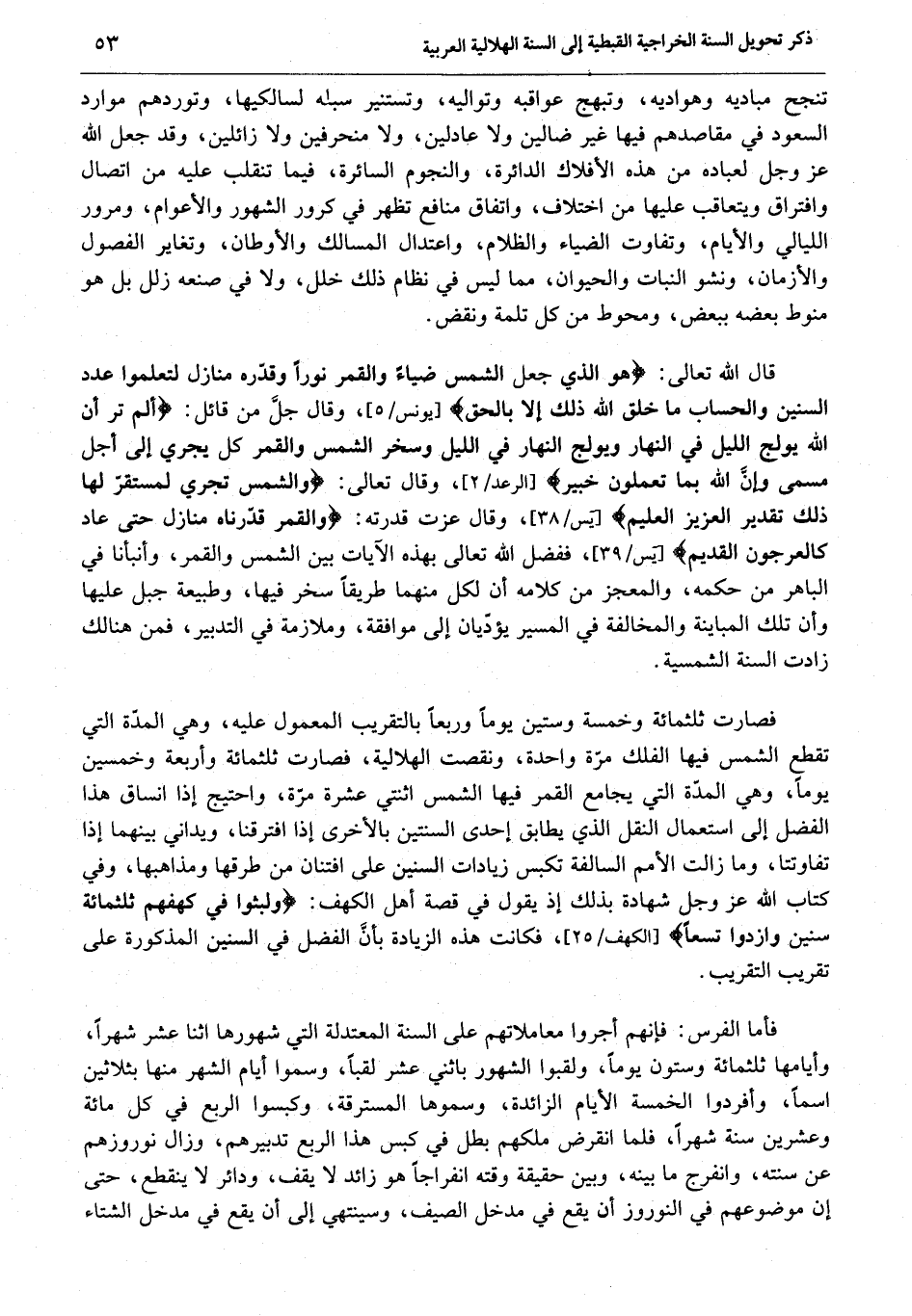 فصارت ثلثمائة وخمسة وستين يوما وربعا بالتقريب المعمول عليه، وهي المدّة التي تقطع الشمس فيها الفلك مرّة واحدة، ونقصت الهلالية، فصارت ثلثمائة وأربعة وخمسين يوما، وهي المدّة التي يجامع القمر فيها الشمس اثنتي عشرة مرّة، واحتيج إذا انساق هذا الفضل إلى استعمال النقل الذي يطابق إحدى السنتين بالأخرى إذا افترقنا، ويداني بينهما إذا تفاوتتا، وما زالت الأمم السالفة تكبس زيادات السنين على افتنان من طرقها ومذاهبها، وفي كتاب الله عز وجل شهادة بذلك إذ يقول في قصة أهل الكهف: وَلَبِثُوا فِي كَهْفِهِمْ ثَلاثَ مِائَةٍ سِنِينَ وَازْدَادُوا تِسْعاً