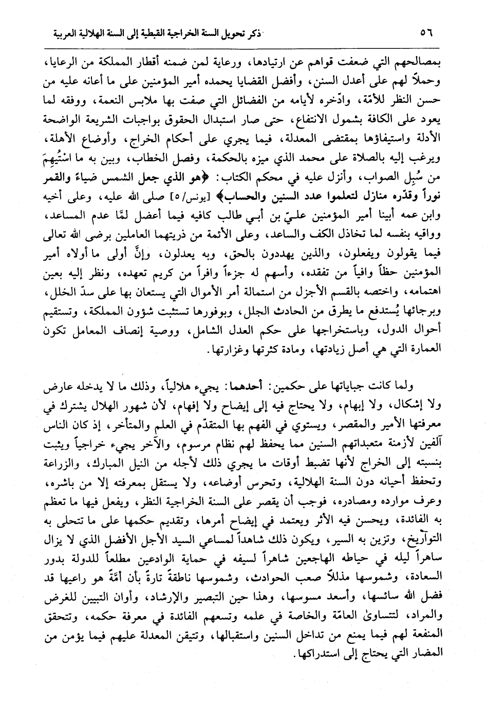 ولما كانت جباياتها على حكمين: أحدهما: يجيء هلاليا، وذلك ما لا يدخله عارض ولا إشكال، ولا إبهام، ولا يحتاج فيه إلى إيضاح ولا إفهام، لأن شهور الهلال يشترك في معرفتها الأمير والمقصر، ويستوي في الفهم بها المتقدّم في العلم والمتأخر، إذ كان الناس آلفين لأزمنة متعبداتهم السنين مما يحفظ لهم نظام مرسوم، والآخر يجيء خراجيا ويثبت بنسبته إلى الخراج لأنها تضبط أوقات ما يجري ذلك لأجله من النيل المبارك، والزراعة وتحفظ أحيانه دون السنة الهلالية، وتحرس أوضاعه، ولا يستقل بمعرفته إلا من باشره، وعرف موارده ومصادره، فوجب أن يقصر على السنة الخراجية النظر، ويفعل فيها ما تعظم به الفائدة، ويحسن فيه الأثر ويعتمد في إيضاح أمرها، وتقديم حكمها على ما تتحلى به التواريخ، وتزين به السير، ويكون ذلك شاهدا لمساعي السيد الأجل الأفضل الذي لا يزال ساهرا ليله في حياطه الهاجعين شاهرا لسيفه في حماية الوادعين مطلعا للدولة بدور السعادة، وشموسها مذللا صعب الحوادث، وشموسها ناطقة تارة بأن أمّة هو راعيها قد فضل الله سائسها، وأسعد مسوسها، وهذا حين التبصير والإرشاد، وأوان التبيين للغرض والمراد، لتتساوى العامّة والخاصة في علمه وتسعهم الفائدة في معرفة حكمه، وتتحقق المنفعة لهم فيما يمنع من تداخل السنين واستقبالها، وتتيقن المعدلة عليهم فيما يؤمن من المضار التي يحتاج إلى استدراكها.