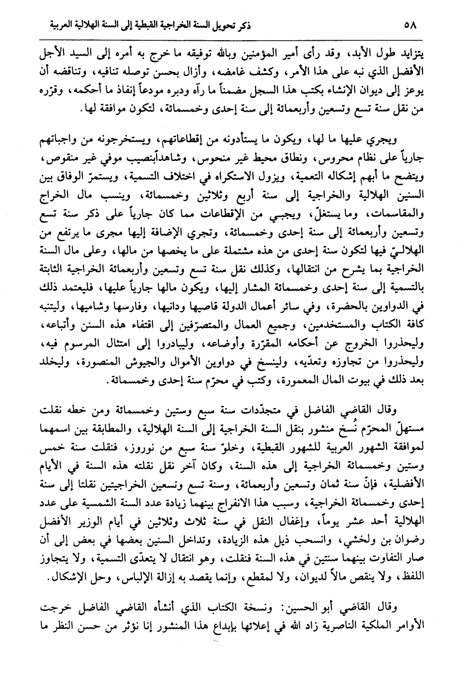 وقال القاضي الفاضل في متجدّدات سنة سبع وستين وخمسمائة ومن خطه نقلت مستهلّ المحرّم نسخ منشور بنقل السنة الخراجية إلى السنة الهلالية، والمطابقة بين اسمهما لموافقة الشهور العربية للشهور القبطية، وخلوّ سنة سبع من نوروز، فنقلت سنة خمس وستين وخمسمائة الخراجية إلى هذه السنة، وكان آخر نقل نقلته هذه السنة في الأيام الأفضلية، فإنّ سنة ثمان وتسعين وأربعمائة، وسنة تسع وتسعين الخراجيتين نقلتا إلى سنة إحدى وخمسمائة الخراجية، وسبب هذا الانفراج بينهما زيادة عدد السنة الشمسية على عدد الهلالية أحد عشر يوما، وإغفال النقل في سنة ثلاث وثلاثين في أيام الوزير الأفضل رضوان بن ولخشي، وانسحب ذيل هذه الزيادة، وتداخل السنين بعضها في بعض إلى أن صار التفاوت بينهما سنتين في هذه السنة فنقلت، وهو انتقال لا يتعدّى التسمية، ولا يتجاوز اللفظ، ولا ينقص مالا لديوان، ولا لمقطع، وإنما يقصد به إزالة الإلباس، وحل الإشكال.