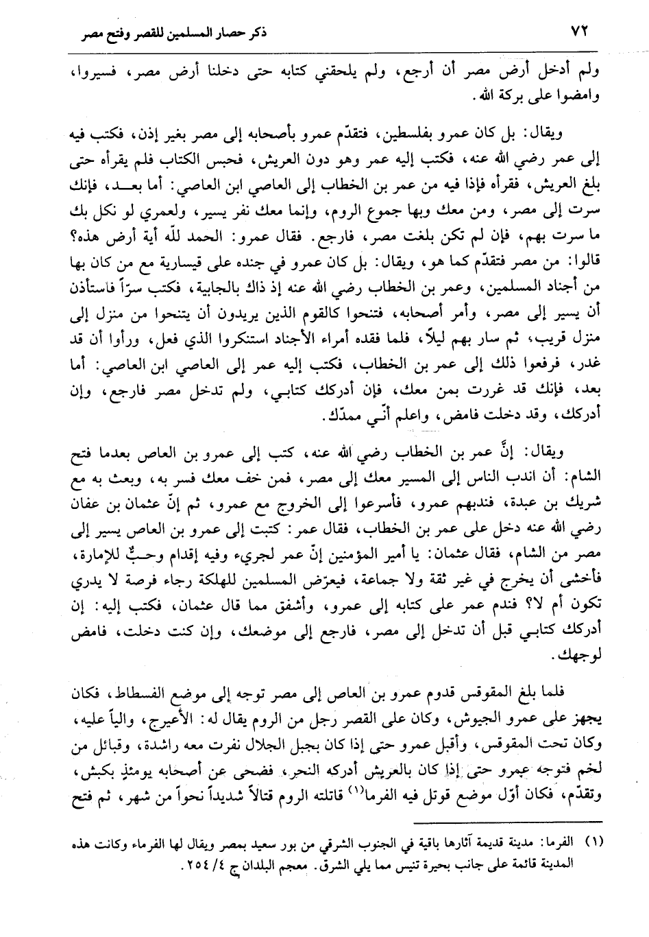 ويقال: بل كان عمرو بفلسطين، فتقدّم عمرو بأصحابه إلى مصر بغير إذن، فكتب فيه إلى عمر رضي الله عنه، فكتب إليه عمر وهو دون العريش، فحبس الكتاب فلم يقرأه حتى بلغ العريش، فقرأه فإذا فيه من عمر بن الخطاب إلى العاصي ابن العاصي: أما بعد، فإنك سرت إلى مصر، ومن معك وبها جموع الروم، وإنما معك نفر يسير، ولعمري لو نكل بك ما سرت بهم، فإن لم تكن بلغت مصر، فارجع. فقال عمرو: الحمد لله أية أرض هذه؟