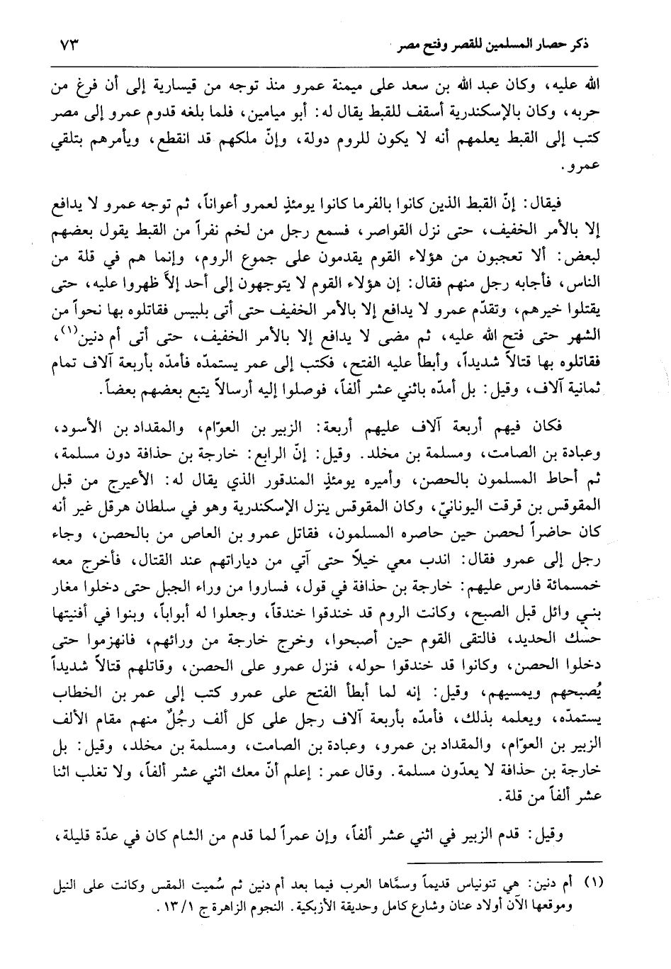 فيقال: إنّ القبط الذين كانوا بالفرما كانوا يومئذ لعمرو أعوانا، ثم توجه عمرو لا يدافع إلا بالأمر الخفيف، حتى نزل القواصر، فسمع رجل من لخم نفرا من القبط يقول بعضهم لبعض: ألا تعجبون من هؤلاء القوم يقدمون على جموع الروم، وإنما هم في قلة من الناس، فأجابه رجل منهم فقال: إن هؤلاء القوم لا يتوجهون إلى أحد إلّا ظهروا عليه، حتى يقتلوا خيرهم، وتقدّم عمرو لا يدافع إلا بالأمر الخفيف حتى أتى بلبيس فقاتلوه بها نحوا من الشهر حتى فتح الله عليه، ثم مضى لا يدافع إلا بالأمر الخفيف، حتى أتى أم دنين «1» ، فقاتلوه بها قتالا شديدا، وأبطأ عليه الفتح، فكتب إلى عمر يستمدّه فأمدّه بأربعة آلاف تمام ثمانية آلاف، وقيل: بل أمدّه باثني عشر ألفا، فوصلوا إليه أرسالا يتبع بعضهم بعضا.