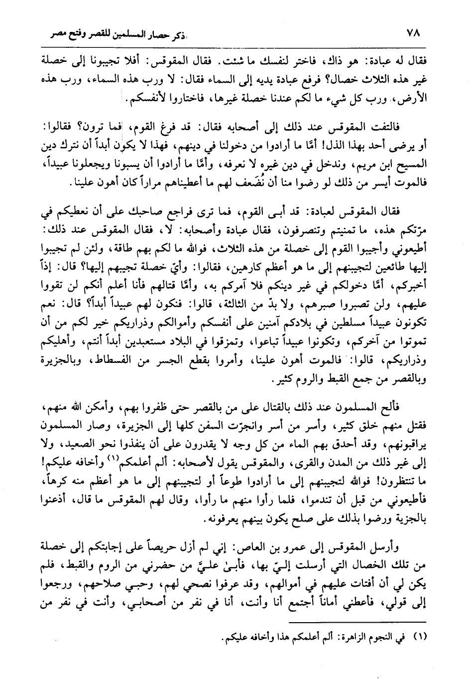 أطيعوني وأجيبوا القوم إلى خصلة من هذه الثلاث، فو الله ما لكم بهم طاقة، ولئن لم تجيبوا إليها طائعين لتجيبنهم إلى ما هو أعظم كارهين، فقالوا: وأيّ خصلة تجيبهم إليها؟ قال: إذا أخبركم، أمّا دخولكم في غير دينكم فلا آمركم به، وأمّا قتالهم فأنا أعلم أنكم لن تقووا عليهم، ولن تصبروا صبرهم، ولا بدّ من الثالثة، قالوا: فنكون لهم عبيدا أبدا؟ قال: نعم تكونون عبيدا مسلطين في بلادكم آمنين على أنفسكم وأموالكم وذراريكم خير لكم من أن تموتوا من آخركم، وتكونوا عبيدا تباعوا، وتمزقوا في البلاد مستعبدين أبدا أنتم، وأهليكم وذراريكم، قالوا: فالموت أهون علينا، وأمروا بقطع الجسر من الفسطاط، وبالجزيرة وبالقصر من جمع القبط والروم كثير.