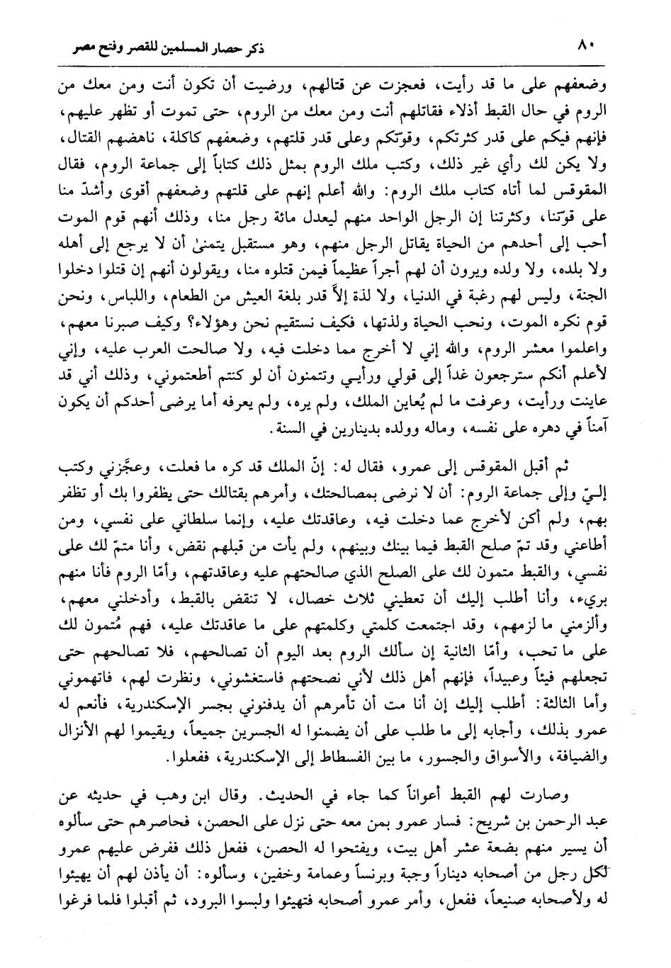 وصارت لهم القبط أعوانا كما جاء في الحديث. وقال ابن وهب في حديثه عن عبد الرحمن بن شريح: فسار عمرو بمن معه حتى نزل على الحصن، فحاصرهم حتى سألوه أن يسير منهم بضعة عشر أهل بيت، ويفتحوا له الحصن، ففعل ذلك ففرض عليهم عمرو لكل رجل من أصحابه دينارا وجبة وبرنسا وعمامة وخفين، وسألوه: أن يأذن لهم أن يهيئوا له ولأصحابه صنيعا، ففعل، وأمر عمرو أصحابه فتهيئوا ولبسوا البرود، ثم أقبلوا فلما فرغوا