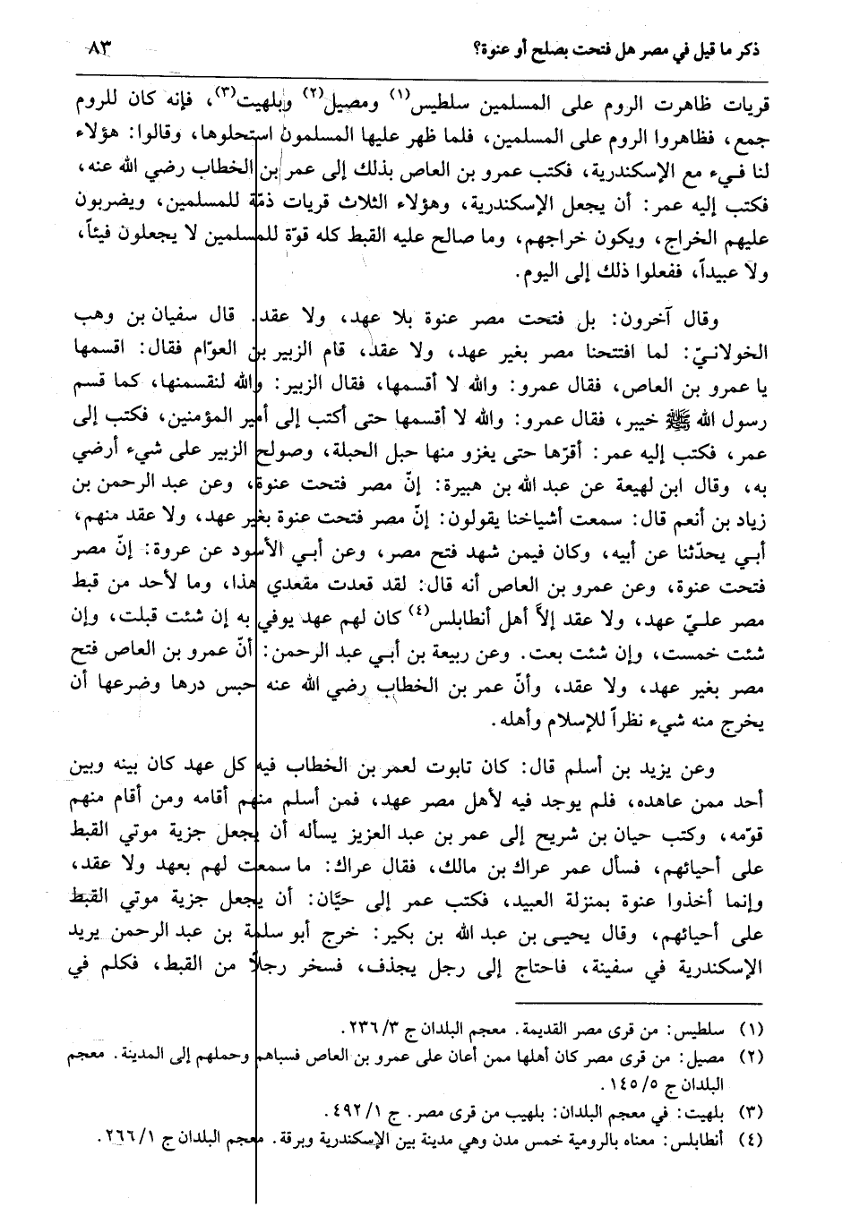 وقال آخرون: بل فتحت مصر عنوة بلا عهد، ولا عقد. قال سفيان بن وهب الخولانيّ: لما افتتحنا مصر بغير عهد، ولا عقد، قام الزبير بن العوّام فقال: اقسمها يا عمرو بن العاص، فقال عمرو: والله لا أقسمها، فقال الزبير: والله لنقسمنها، كما قسم رسول الله صلّى الله عليه وسلّم خيبر، فقال عمرو: والله لا أقسمها حتى أكتب إلى أمير المؤمنين، فكتب إلى عمر، فكتب إليه عمر: أقرّها حتى يغزو منها حبل الحبلة، وصولح الزبير على شيء أرضي به، وقال ابن لهيعة عن عبد الله بن هبيرة: إنّ مصر فتحت عنوة، وعن عبد الرحمن بن زياد بن أنعم قال: سمعت أشياخنا يقولون: إنّ مصر فتحت عنوة بغير عهد، ولا عقد منهم، أبي يحدّثنا عن أبيه، وكان فيمن شهد فتح مصر، وعن أبي الأسود عن عروة: إنّ مصر فتحت عنوة، وعن عمرو بن العاص أنه قال: لقد قعدت مقعدي هذا، وما لأحد من قبط مصر عليّ عهد، ولا عقد إلّا أهل أنطابلس «4» كان لهم عهد يوفي به إن شئت قبلت، وإن شئت خمست، وإن شئت بعت. وعن ربيعة بن أبي عبد الرحمن: أنّ عمرو بن العاص فتح مصر بغير عهد، ولا عقد، وأنّ عمر بن الخطاب رضي الله عنه حبس درها وضرعها أن يخرج منه شيء نظرا للإسلام وأهله.