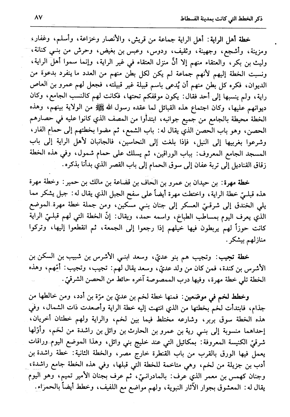 وخطط لخم في موضعين: فمنها خطة لخم بن عديّ بن مرّة بن أدد، ومن خالطها من جذام، فابتدأت لخم بخطتها من الذي انتهت إليه خطة الراية وأصعدت ذات الشمال، وفي هذه الخطة سوق بربر، وشارعه مختلط فيما بين لخم، والراية ولهم خطتان أخريان، إحداهما منسوبة إلى بني رية بن عمرو بن الحارث بن وائل بن راشدة من لخم، وأوّلها شرقيّ الكنيسة المعروفة: بمكائيل التي عند خليج بني وائل، وهذا الموضع اليوم وراقات يعمل فيها الورق بالقرب من باب القنطرة خارج مصر، والخطة الثانية: خطة راشدة بن أدب بن جزيلة من لخم، وهي متاخمة للخطة التي قبلها، وفي هذه الخطة جامع راشدة، وجنان كهمس بن معمر الذي عرف: بالمادرانيّ، ثم عرف بجنان الأمير تميم، وهو اليوم يقال له: المعشوق بجوار الآثار النبوية، ولهم مواضع مع اللفيف، وخطط أيضا بالحمراء.