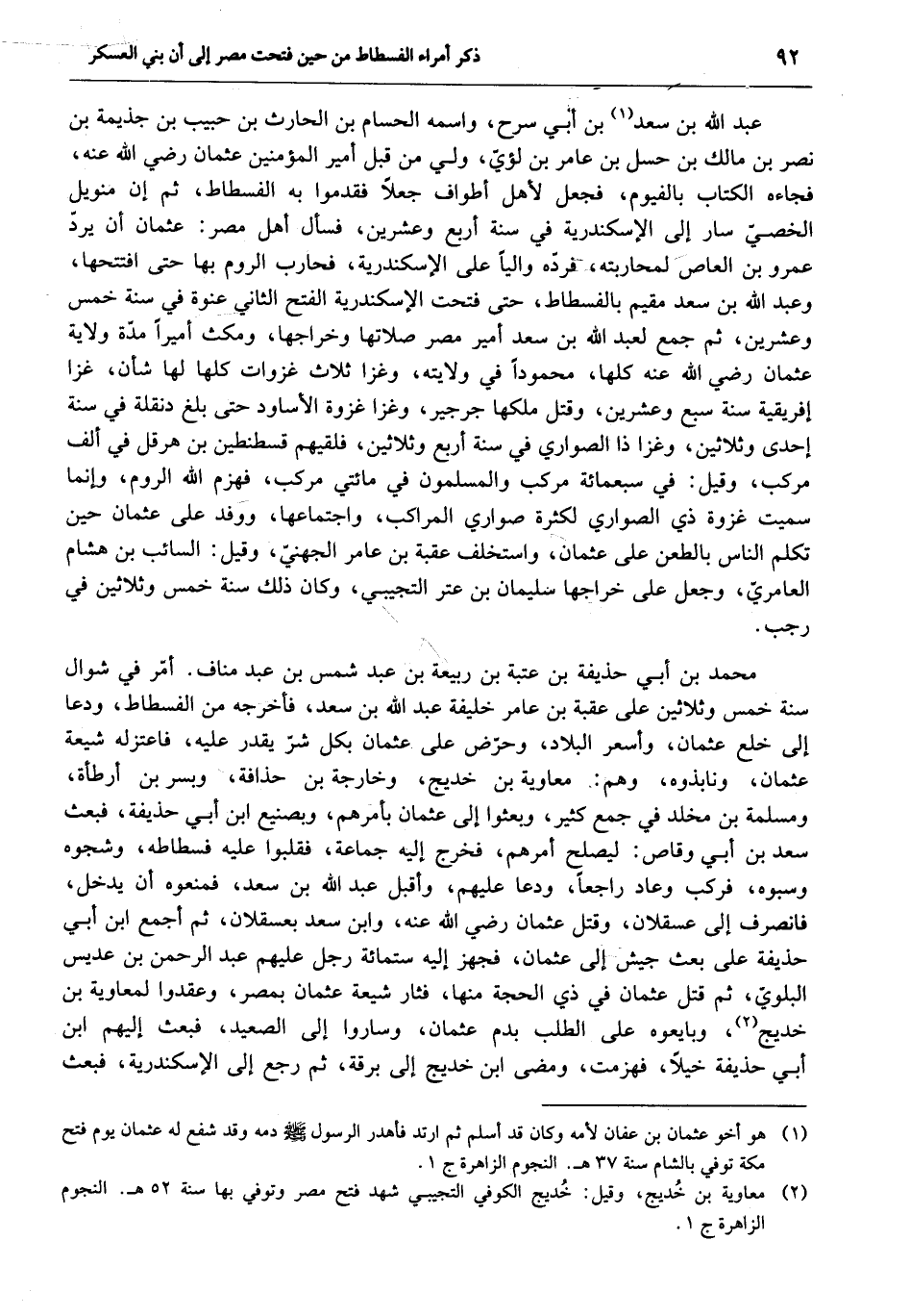 عبد الله بن سعد «1» بن أبي سرح، واسمه الحسام بن الحارث بن حبيب بن جذيمة بن نصر بن مالك بن حسل بن عامر بن لؤيّ، ولي من قبل أمير المؤمنين عثمان رضي الله عنه، فجاءه الكتاب بالفيوم، فجعل لأهل أطواف جعلا فقدموا به الفسطاط، ثم إن منويل الخصيّ سار إلى الإسكندرية في سنة أربع وعشرين، فسأل أهل مصر: عثمان أن يردّ عمرو بن العاص لمحاربته، فردّه واليا على الإسكندرية، فحارب الروم بها حتى افتتحها، وعبد الله بن سعد مقيم بالفسطاط، حتى فتحت الإسكندرية الفتح الثاني عنوة في سنة خمس وعشرين، ثم جمع لعبد الله بن سعد أمير مصر صلاتها وخراجها، ومكث أميرا مدّة ولاية عثمان رضي الله عنه كلها، محمودا في ولايته، وغزا ثلاث غزوات كلها لها شأن، غزا إفريقية سنة سبع وعشرين، وقتل ملكها جرجير، وغزا غزوة الأساود حتى بلغ دنقلة في سنة إحدى وثلاثين، وغزا ذا الصواري في سنة أربع وثلاثين، فلقيهم قسطنطين بن هرقل في ألف مركب، وقيل: في سبعمائة مركب والمسلمون في مائتي مركب، فهزم الله الروم، وإنما سميت غزوة ذي الصواري لكثرة صواري المراكب، واجتماعها، ووفد على عثمان حين تكلم الناس بالطعن على عثمان، واستخلف عقبة بن عامر الجهنيّ، وقيل: السائب بن هشام العامريّ، وجعل على خراجها سليمان بن عتر التجيبي، وكان ذلك سنة خمس وثلاثين في رجب.