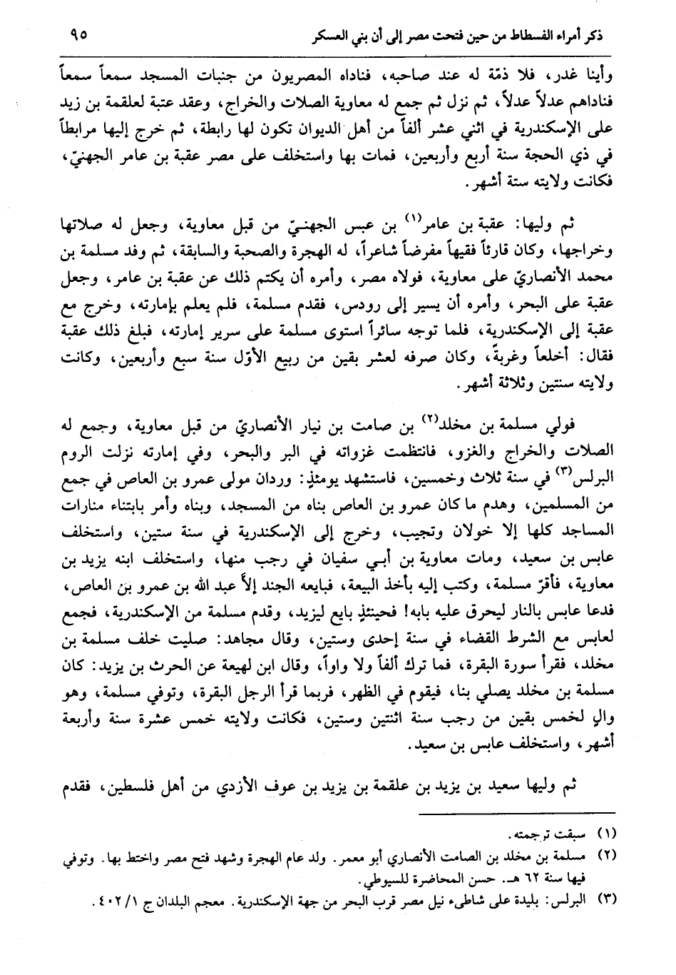 فولي مسلمة بن مخلد «2» بن صامت بن نيار الأنصاريّ من قبل معاوية، وجمع له الصلات والخراج والغزو، فانتظمت غزواته في البر والبحر، وفي إمارته نزلت الروم البرلس «3» في سنة ثلاث وخمسين، فاستشهد يومئذ: وردان مولى عمرو بن العاص في جمع من المسلمين، وهدم ما كان عمرو بن العاص بناه من المسجد، وبناه وأمر بابتناء منارات المساجد كلها إلا خولان وتجيب، وخرج إلى الإسكندرية في سنة ستين، واستخلف عابس بن سعيد، ومات معاوية بن أبي سفيان في رجب منها، واستخلف ابنه يزيد بن معاوية، فأقرّ مسلمة، وكتب إليه بأخذ البيعة، فبايعه الجند إلّا عبد الله بن عمرو بن العاص، فدعا عابس بالنار ليحرق عليه بابه! فحينئذ بايع ليزيد، وقدم مسلمة من الإسكندرية، فجمع لعابس مع الشرط القضاء في سنة إحدى وستين، وقال مجاهد: صليت خلف مسلمة بن مخلد، فقرأ سورة البقرة، فما ترك ألفا ولا واوا، وقال ابن لهيعة عن الحرث بن يزيد: كان مسلمة بن مخلد يصلي بنا، فيقوم في الظهر، فربما قرأ الرجل البقرة، وتوفي مسلمة، وهو وال لخمس بقين من رجب سنة اثنتين وستين، فكانت ولايته خمس عشرة سنة وأربعة أشهر، واستخلف عابس بن سعيد.