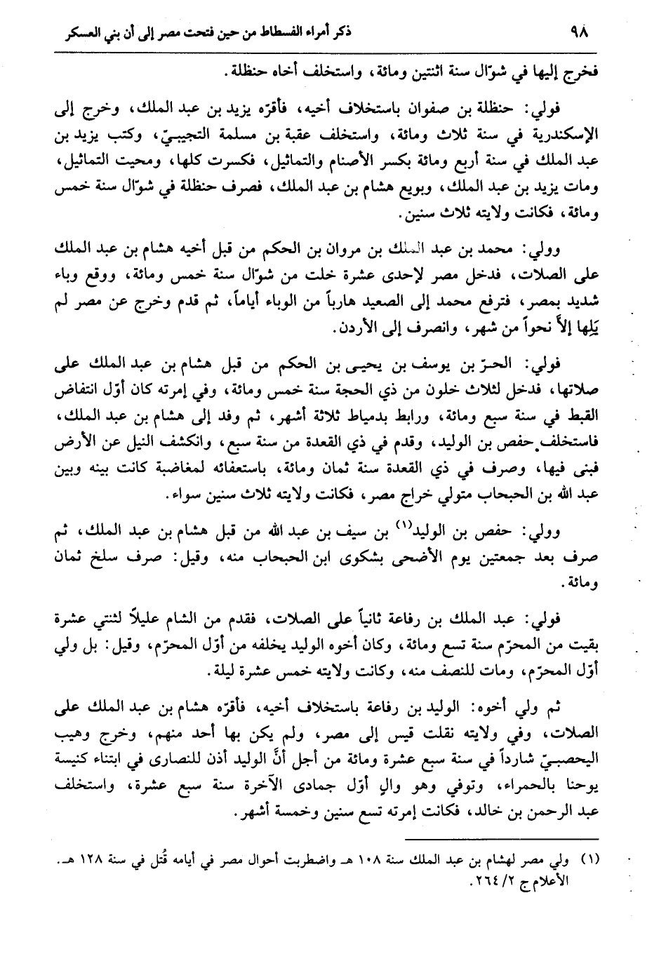 فولي: حنظلة بن صفوان باستخلاف أخيه، فأقرّه يزيد بن عبد الملك، وخرج إلى الإسكندرية في سنة ثلاث ومائة، واستخلف عقبة بن مسلمة التجيبيّ، وكتب يزيد بن عبد الملك في سنة أربع ومائة بكسر الأصنام والتماثيل، فكسرت كلها، ومحيت التماثيل، ومات يزيد بن عبد الملك، وبويع هشام بن عبد الملك، فصرف حنظلة في شوّال سنة خمس ومائة، فكانت ولايته ثلاث سنين.