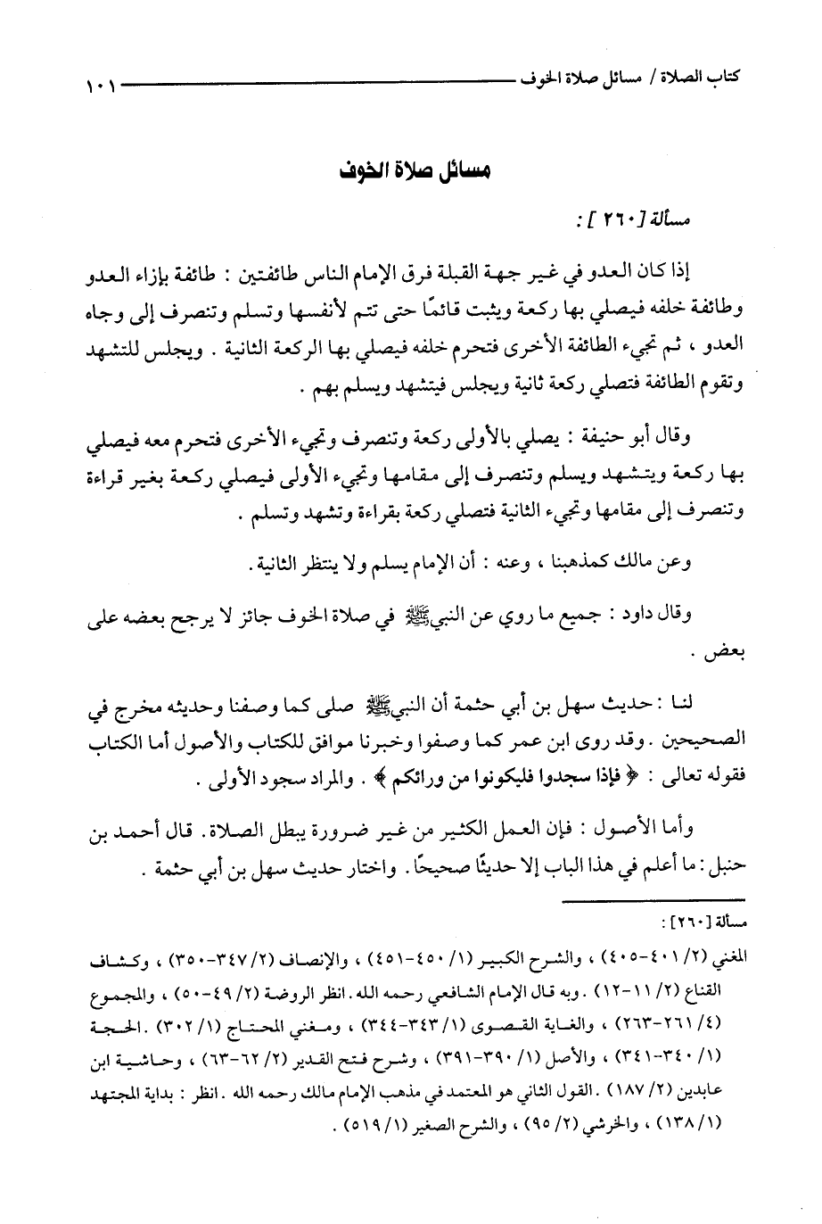 إذا كان العدو في غير جهة القبلة فرق الإمام الناس طائفتين : طائفة بإزاء العدو وطائفة خلفه فيصلي بها ركعة ويثبت قائما حتى تتم لأنفسها وتسلم وتنصرف إلى وجاه العدو ، ثم تجيء الطائفة الأخرى فتحرم خلفه فيصلي بها الركعة الثانية .