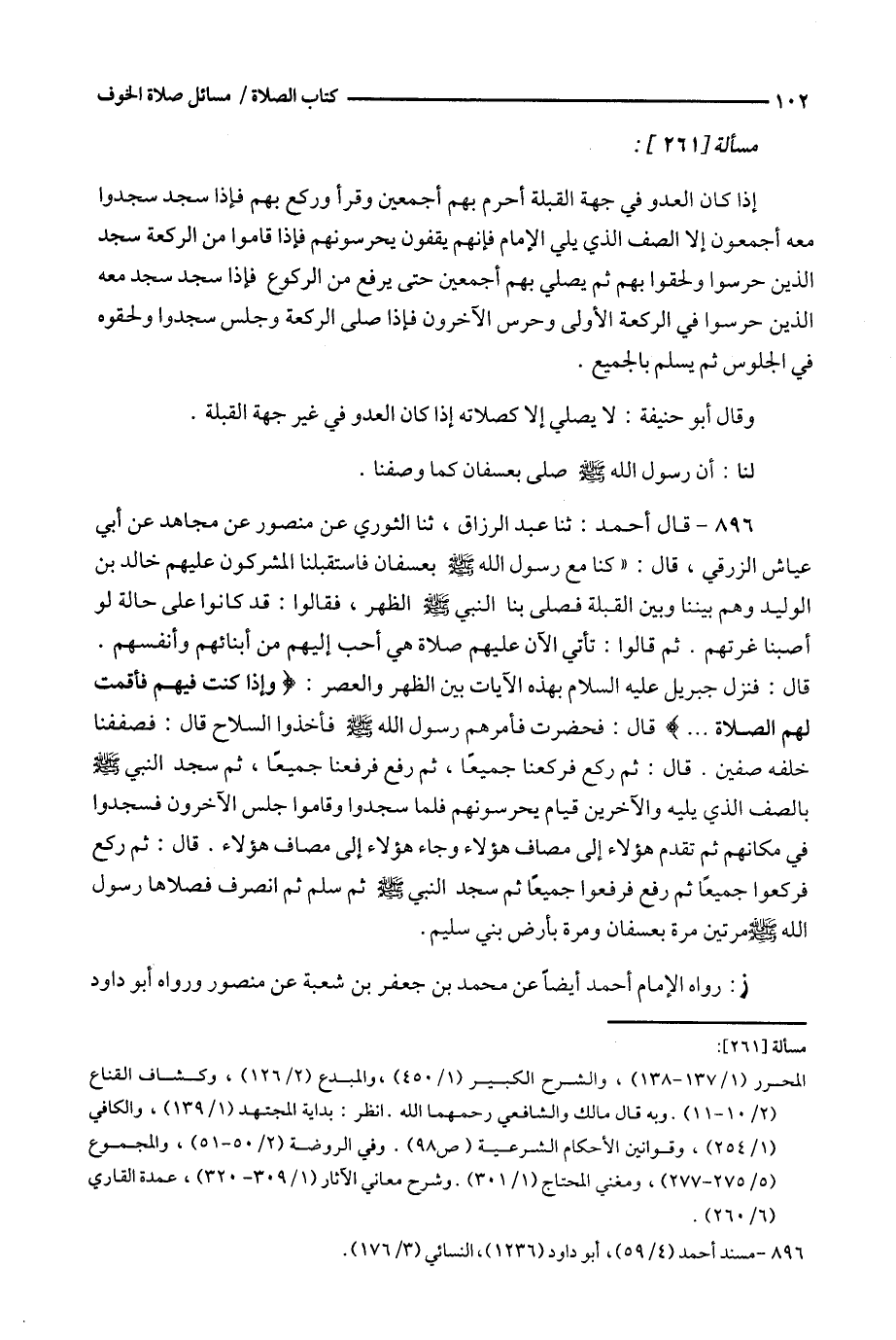 896 - قال أحمد : ثنا عبد الرزاق ، ثنا الثوري عن منصور عن مجاهد عن أبي عياش الزرقي ، قال : ' كنا مع رسول الله بعسفان فاستقبلنا المشركون عليهم خالد بن الوليد وهم بيننا وبين ا لقبلة فصلى بنا النبي الظهر ، فقالوا : قد كانوا على حالة لو أصبنا غرتهم .