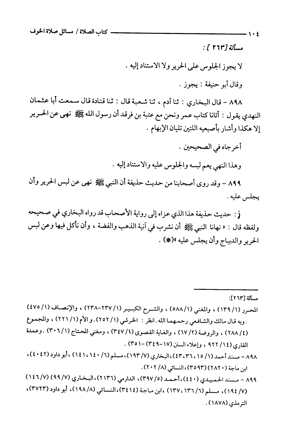 899 - وقد روى أصحابنا من حديث حذيفة أن النبي نهى عن لبس الحرير وأن يجلس عليه .