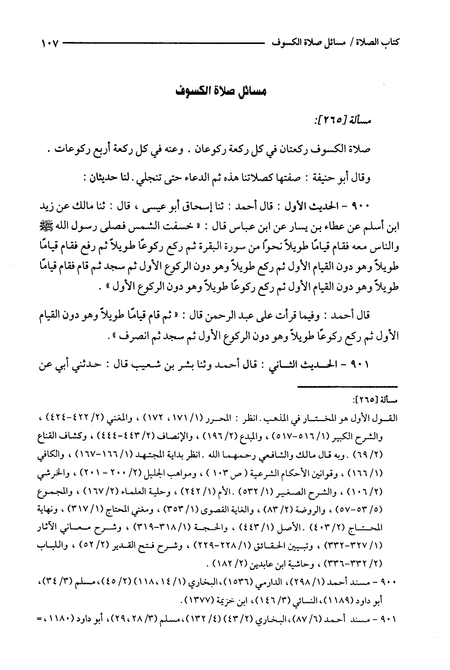 900 - الحديث الأول : قال أحمد : ثنا إسحاق أبو عيسى ، قال : ثنا مالك عن يزيد ابن أسلم عن عطاء بن يسار عن ابن عباس قال : ' خسفت الشمس فصلى رسول الله والناس معه فقام قياما طويلا نحوا من سورة البقرة ثم ركع ركوعا طويلا ثم رفع فقام قياما طويلا وهو دون القيام الأول ثم ركع طويلا وهو دون الركوع الأول ثم سجد ثم قام فقام قياما طويلا وهو دون القيام الأول ثم ركع ركوعا طويلا وهو دون الركوع الأول ' .