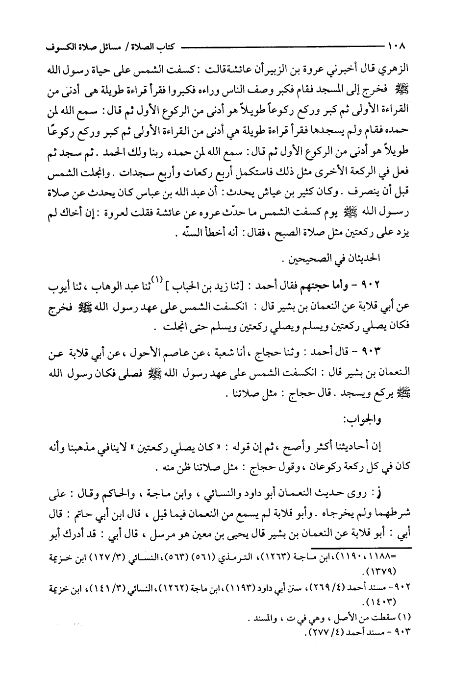 902 - وأما حجتهم فقال أحمد : [ ثنا زيد بن الحباب ] ثنا عبد الوهاب ، ثنا أيوب عن أبي قلابة عن النعمان بن بشير قال : انكسفت الشمس على عهد رسول الله فخرج فكان يصلي ركعتين ويسلم ويصلي ركعتين ويسلم حتى انجلت .