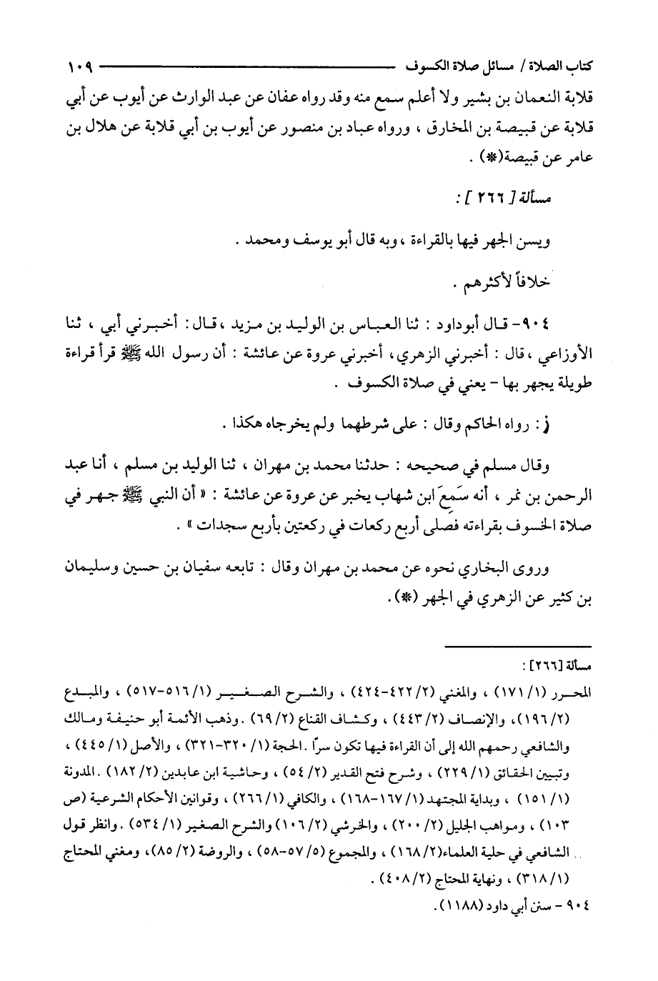 904 - قال أبو داود : ثنا العباس بن الوليد بن مزيد ، قال : أخبرني أبي ، ثنا الأوزاعي ، قال : أخبرني الزهري ، أخبرني عروة عن عائشة : أن رسول الله قرأ قراءة طويلة يجهر بها - يعني في صلاة الكسوف .