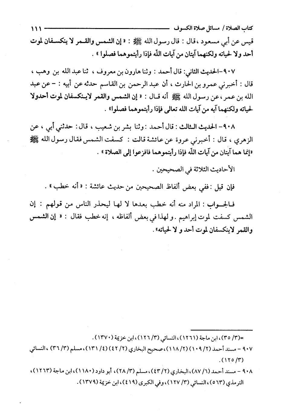 907 - الحديث الثاني : قال أحمد : وثنا هارون بن معروف ، ثنا عبد الله بن وهب ، قال أخبرني عمرو بن الحارث ، أن عبد الرحمن بن القاسم حدثه عن أبيه : - عن عبد الله بن عمر ، عن رسول الله أنه قال : ' إن الشمس والقمر لا ينكسفان لموت أحد ولا لحياته ولكنهما آية من ى يات تعالى فإذا رأيتموهما فصلوا ' .
