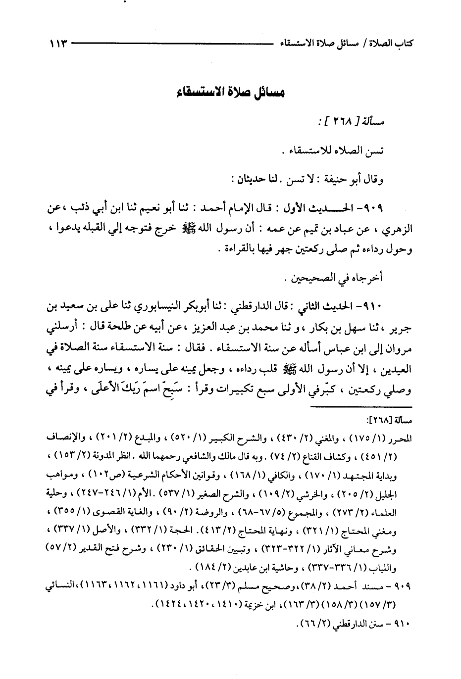 909 - الحديث الأول : قال الإمام أحمد : ثنا أبو نعيم ثنا ابن أبي ذئب ، عن الزهري ، عن عباد بن تميم عن عمه : أن رسول الله خرج فتوجه إلي القبلة يدعوا ، وحول رداءه ثم صلى ركعتين جهر فيها بالقراءة .