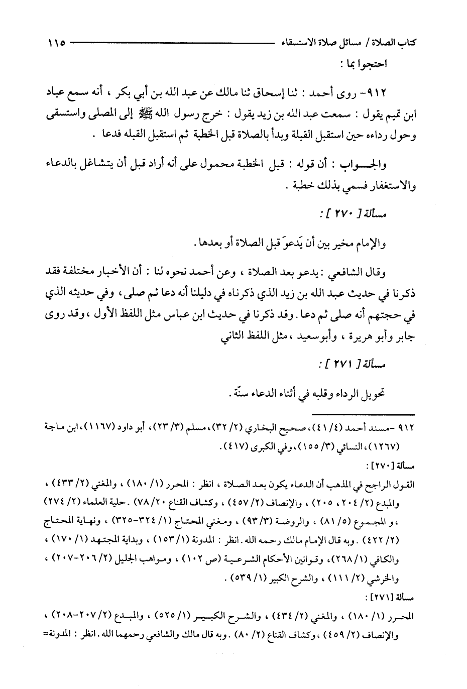 912 - روى أحمد : ثنا إسحاق ثنا مالك عن عبد الله بن أبي بكر ، أنه سمع عباد ابن تميم يقول : سمعت عبد الله بن زيد يقول : خرج رسول الله إلى المصلى واستسقى وحول رداءه حين استقبل القبلة وبدأ بالصلاة قبل الخطبة ثم استقبل القبلة فدعا .