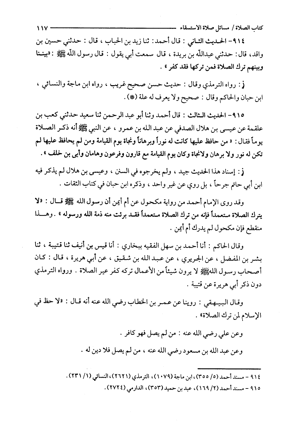 914 - الحديث الثاني : قال أحمد : ثنا زيد بن الحباب ، قال : حدثني حسين بن واقد ، قال : حدثني عبد الله بن بريدة ، قال سمعت أبي يقول : قال رسول الله : ' بيننا وبينهم ترك الصلاة فمن تركها فقد كفر ' .
