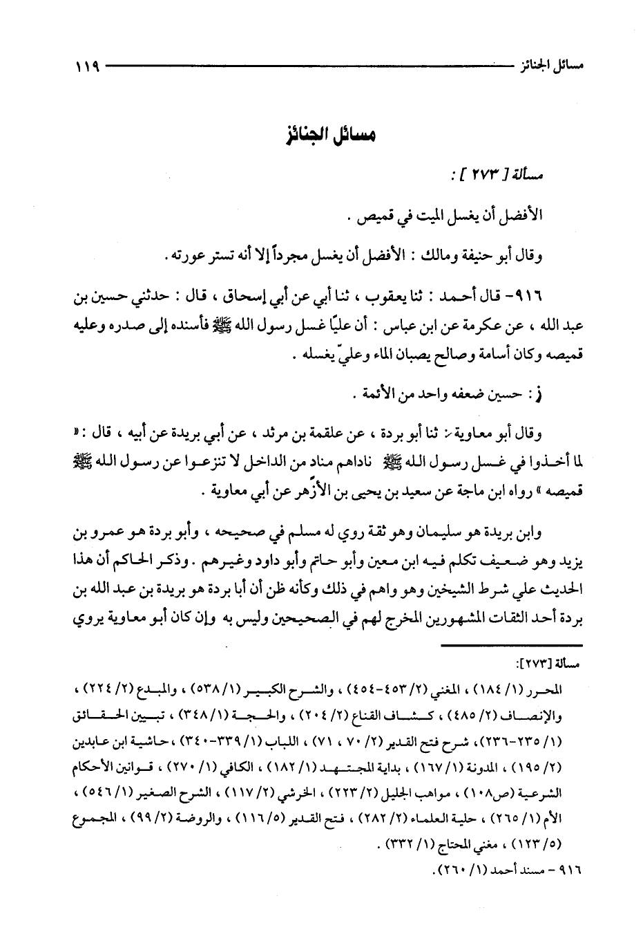 916 - قال أحمد : ثنا يعقوب ، ثنا أبي عن أبي إسحاق ، قال : حدثني حسين بن عبد الله ، عن عكرمة عن ابن عباس : أن عليا غسل رسول الله فأسنده إلى صدره وعليه قميصه وكان أسامة وصالح يصبان الماء وعلي يغسله . ز : حسين ضعفه واحد من الأئمة .