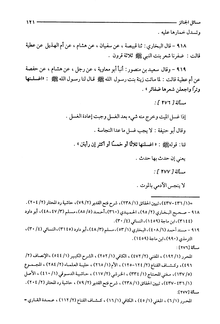 919 - وقال سعيد بن منصور : أنبأ أبو معاوية ، عن رجل ، عن هشام ، عن حفصة عن أم عطية قالت : لما ماتت زينة نت رسول الله قال لنا رسول الله : ' اغسلنها وترا واجعلن شعرها ضفائر ' .