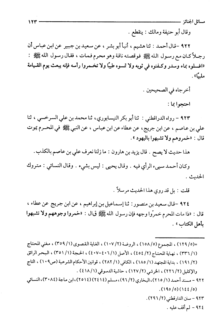 923 - رواه الدارقطني : ثنا أبو بكر النيسابوري ، ثنا محمد بن علي السرخسي ، ثنا علي بن عاصم ، عن ابن جريج ، عن عطاء عن ابن عباس ، عن النبي في المحرم يموت قا : ' خمروهم ولا تشبهوا باليهود ' .