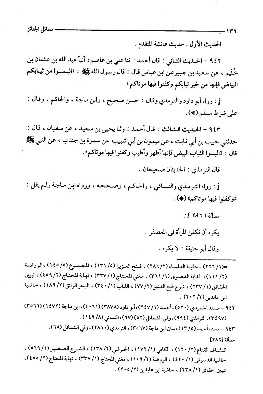 ز : رواه الترمذي والنسائي ، والحاكم ، وصححه ، ورواه ابن ماجه ولم يقل : ' وكفنوا فيها موتاكم ' .