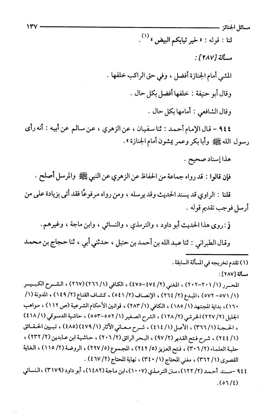 944 - قال الإمام أحمد : ثنا سفيان ، عن الزهري ، عن سالم عن أبيه : أنه رأى رسول الله وأبا بكر وعمر يمشون أمام الجنازة ' .
