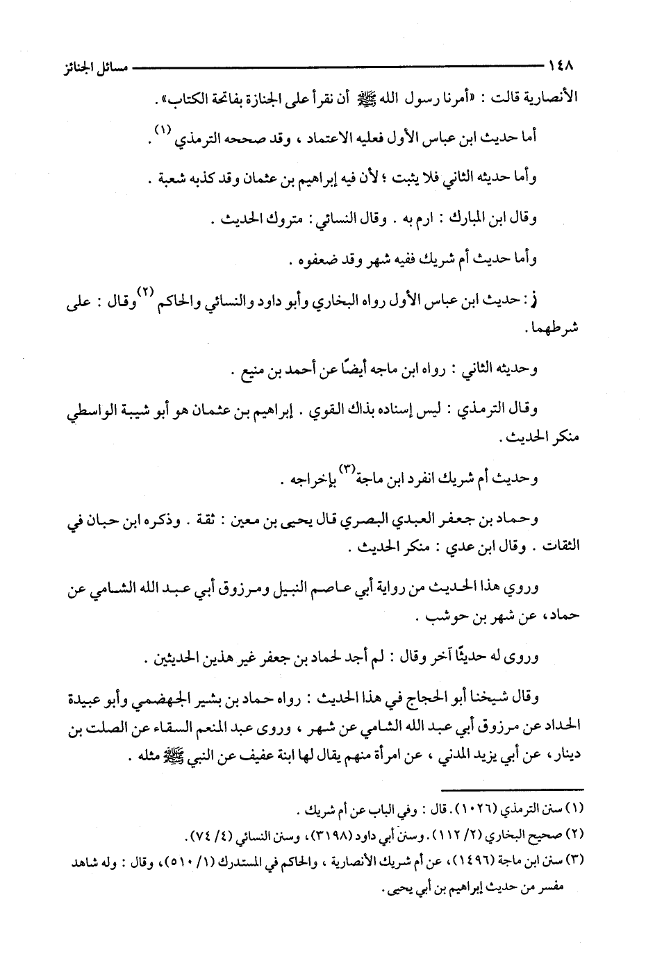 الأنصارية قالت : ' أمرنا رسول الله أن نقرأ على الجنازة بفاتحة الكتاب ' .