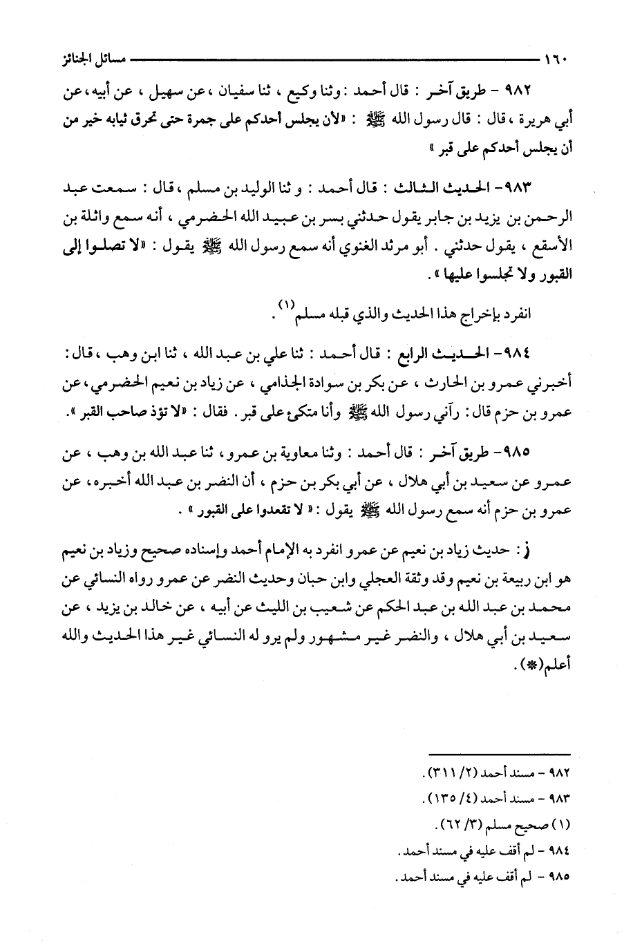 984 - الحديث الرابع : قال أحمد : ثنا علي بن عبد الله ، ثنا ابن وهب ، قال : أخبرني عمرو بن الحارث ، عن بكر بن سوادة الجذامي ، عن زياد بن نعيم الحضرمي ، عن عمرو بن حزم قال : رآني رسول الله وأنا متكئ على قبر . فقال : : ' لا تؤذ صاحب القبر ' . 985 - طريق آخر : قال محمد : وثنا معاوية بن عمرو ، ثنا عبد الله بن وهب ، عن عمرو عن سعيد بن أبي هلال ، عن أبي بكر بن حزم ، أن النضر بن عبد الله أخبره ، عن عمرو بن حزم أنه سمع رسول الله يقول : ' لا تقعدوا على القبور ' .