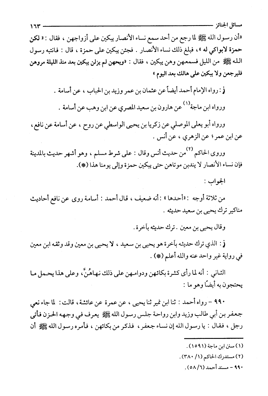 990 - رواه أحمد : ثنا ابن نمير ثنا يحي ، عن عمرة عن عائشة ، قالت : لما جاء نعي جعفر بن أبي طالب وزيد وابن رواحة جلس رسول الله يعرف في وجهه الحزن فأتى رجل ، فقال : يا رسول الله إن نساء جعفر ، فذكر من بكائهن ، فأمره رسول الله أن