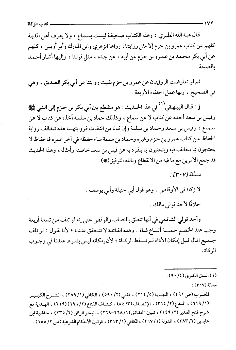 ز : قال البيهقي في هذا الحديث : هو منقطع بين أبي بكر بن حزم إلى النبي وقيس بن سعد أخذه عن كتاب لا عن سماع ، وكذلك حماد بن سلمة أخذه عن كتاب لا عن سماع ، وقيس بن سعد وحماد بن سلمة وإن كانا من الثقات فروايتهما هذه تخالف رواية الحفاظ عن كتاب عمرو بن حزم وغيره وحماد بن سلمة ساء حفظه في آخر عمره فالحفاظ لا يحتجون بما يخالف فيه ويتجنبون بما ينفرد به عن قيس بن سعد خاصته وأمثاله ، وهذا الحديث قد جمع الأمرين مع ما فيه من الانقطاع وبالله التوفيق .