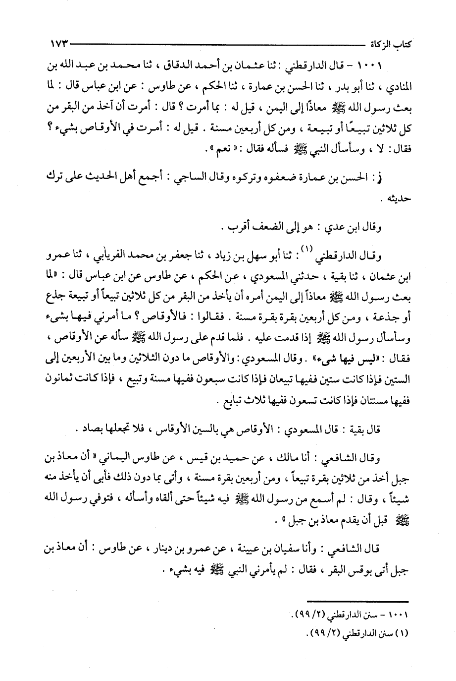 1001 - قال الدارقطني : ثنا عثمان بن أحمد الدقاق ، ثنا محمد بن عبد الله بن المنادي ، ثنا أبو بدر ، ثنا الحسن بن عمارة ، ثنا الحكم ، عن طاوس : عن ابن عباس قال : لما بعث رسول الله معاذا إلى اليمن ، قيل له : بما أمرت ؟ قال : أمرت أن آخذ من البقر من كل ثلاثين تبيعا أو تبيعة ، ومن كل أربعين مسنة .