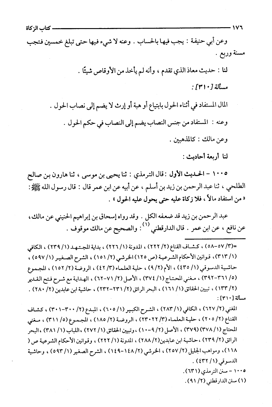1005 - الحديث الأول : قال الترمذي : ثنا يحي بن موسى ، ثنا هارون بن صالح الطلحي ، ثنا عبد الرحمن بن زيد بن أسلم ، عن أبيه عن ابن عمر قال : قال رسول الله : ' من استفاد مالا ، فلا زكاة عليه حتى يحول عليه الحول ' .