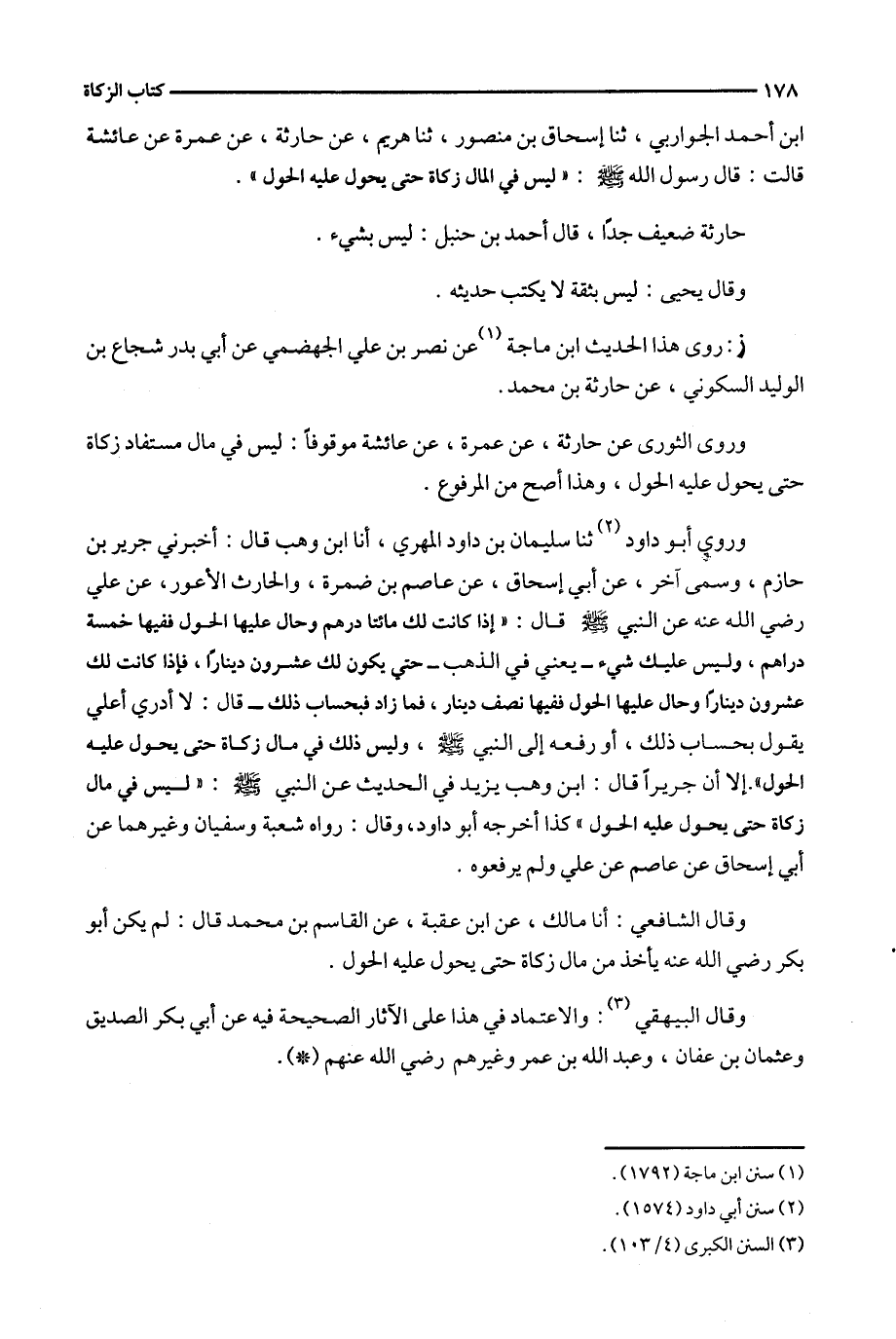 وروى أبو داود ثنا سليمان بن داود المهري ، أنا ابن وهب قال : أخبرني جرير بن حازم ، وسمى آخر ، عن أبي إسحاق ، عن عاصم بن ضمرة ، والحارث الأعور ، عن علي رضي الله عنه عن النبي قال : ' إذا كانت لك مائتا درهم وحال عليها الحول ففيها خمسة دراهم ، وليس عليك شيء - يعني في الذهب - حتى يكون لك عشرون ديناراً ، فإذا كانت لك عشرون دينارا وحال عليها الحول ففيها نصف دينار ، فما زاد فبحساب ذلك - قال : لا أدري أعلي يقول بحساب ذلك ، أو رفعه إلى النبي ، وليس ذلك في مال زكاة حتى يحول عليه الحول ' .