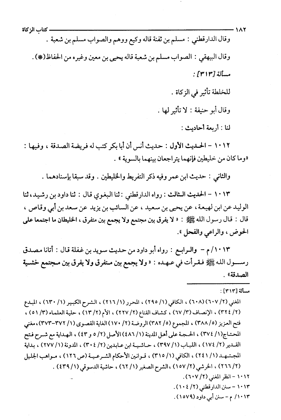1013 - الحديث الثالث : رواه الدارقطني : ثنا البغوي قال : ثنا داود بن رشيد ، ثنا الوليد عن ابن لهيعة ، عن يحي بن سعيد ، عن السائب بن يزيد عن سعد بن أبي وقاص ، قال : قال رسول الله : ' لا يفرق بين مجتمع ولا يجمع بين متفرق ، الخليطان ما اجتمعا على الحوض ، والراعي والفحل ' .