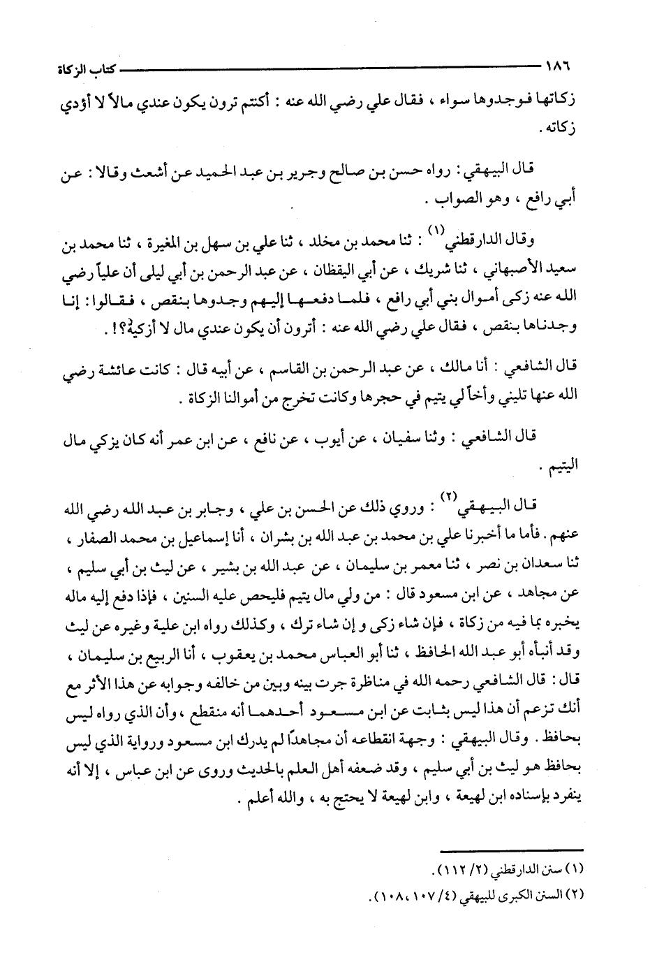 وقال الدارقطني : ثنا محمد بن مخلد ، ثنا علي بن سهل بن المغيرة ، ثنا محمد بن سعيد الأصبهاني ، ثنا شريك ، عن أبي اليقظان ، عن عبد الرحمن بن أبي ليلى أن عليا رضي الله عنه زكى أموال بني أبي رافع ، فلما دفعها إليهم وجدوها بنقص ، فقالوا : إنا وجدناها بنقص ، فقال علي رضي الله عنه : أترون أن يكون عندي مال لا أزكيه ؟ ! .