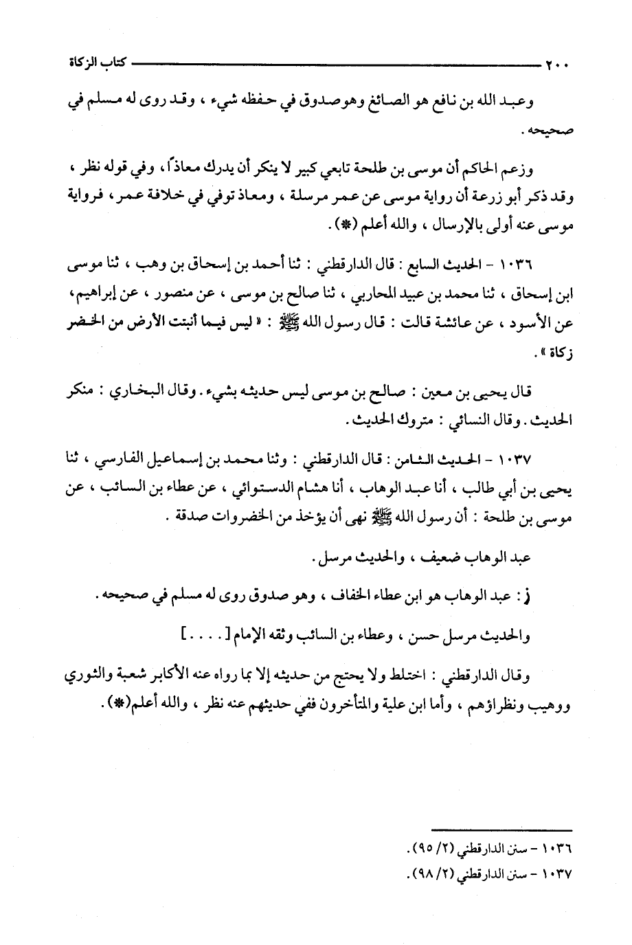 1037 - الحديث الثامن : قال الدارقطني : وثنا محمد بن إسماعيل الفارسي ، ثنا يحي بن أبي طالب ، أنا عبد الوهاب ، أنا هشام الدستوائي ، عن عطاء بن السائب ، عن موسى بن طلحة : أن رسول الله نهى أن يؤخذ من الخضروات صدقة .