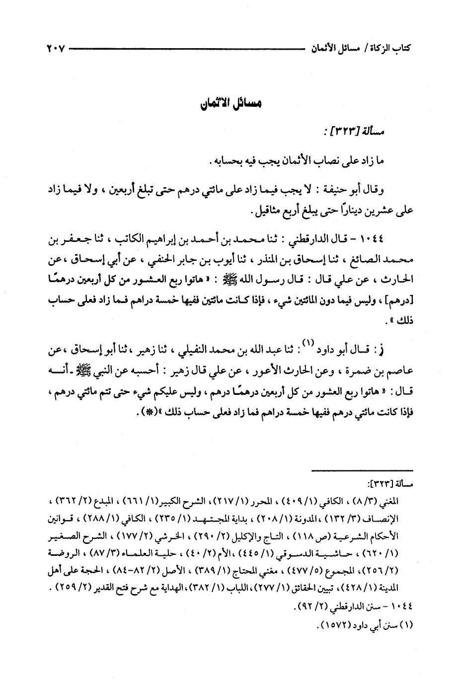 ز : قال أبو داود : ثنا عبد الله بن محمد النفيلي ، ثنا زهير ، ثنا أبو إسحاق ، عن عاصم بن ضمرة ، وعن الحارث الأعور ، عن علي قال زهير : أحسبه عن النبي - أنه قال : ' هاتوا ربع العشور من كل أربعين درهما درهم ، وليس عليكم شيء حتى تتم مائتي درهم ، فإذا كانت مائتي درهم ففيها خمسة دراهم فما زاد فعلى حساب ذلك ' .