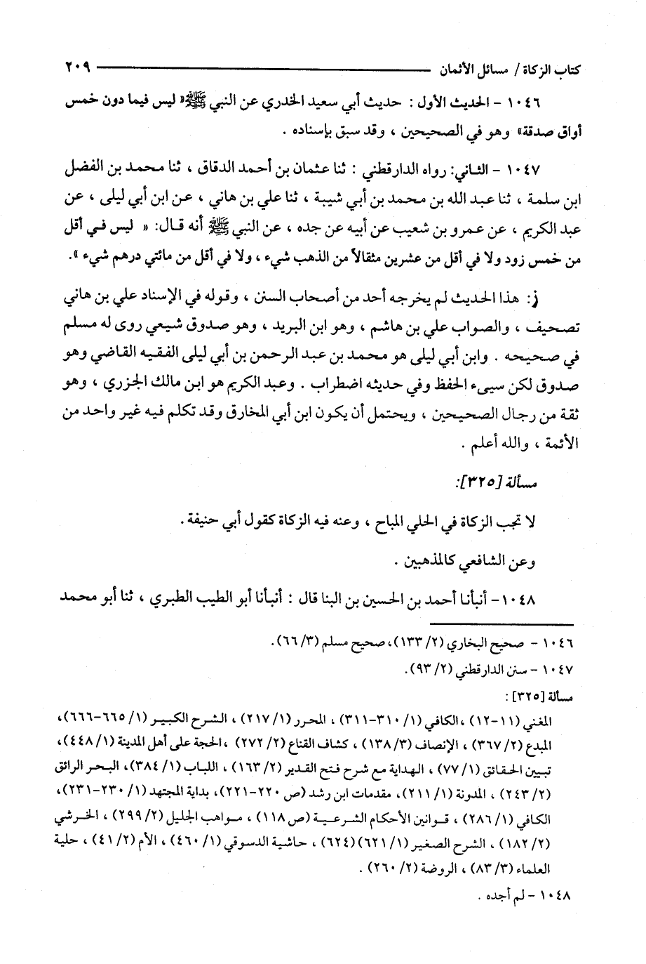 1047 - الثاني : رواه الدارقطني : ثنا عثمان بن أحمد الدقاق ، ثنا محمد بن الفضل ابن سلمة ، ثنا عبد الله بن محمد بن أبي شيبة ، ثنا علي بن هاني ، عن ابن أبي ليلى ، عن عبد الكريم ، عن عمرو بن شعيب عن أبيه عن جده ، عن النبي أنه قال : ' ليس في أقل من خمس زود ولا في أقل من عشرين مثقالا من الذهب شيء ، ولا في أقل من مائتي درهم شيء ' .