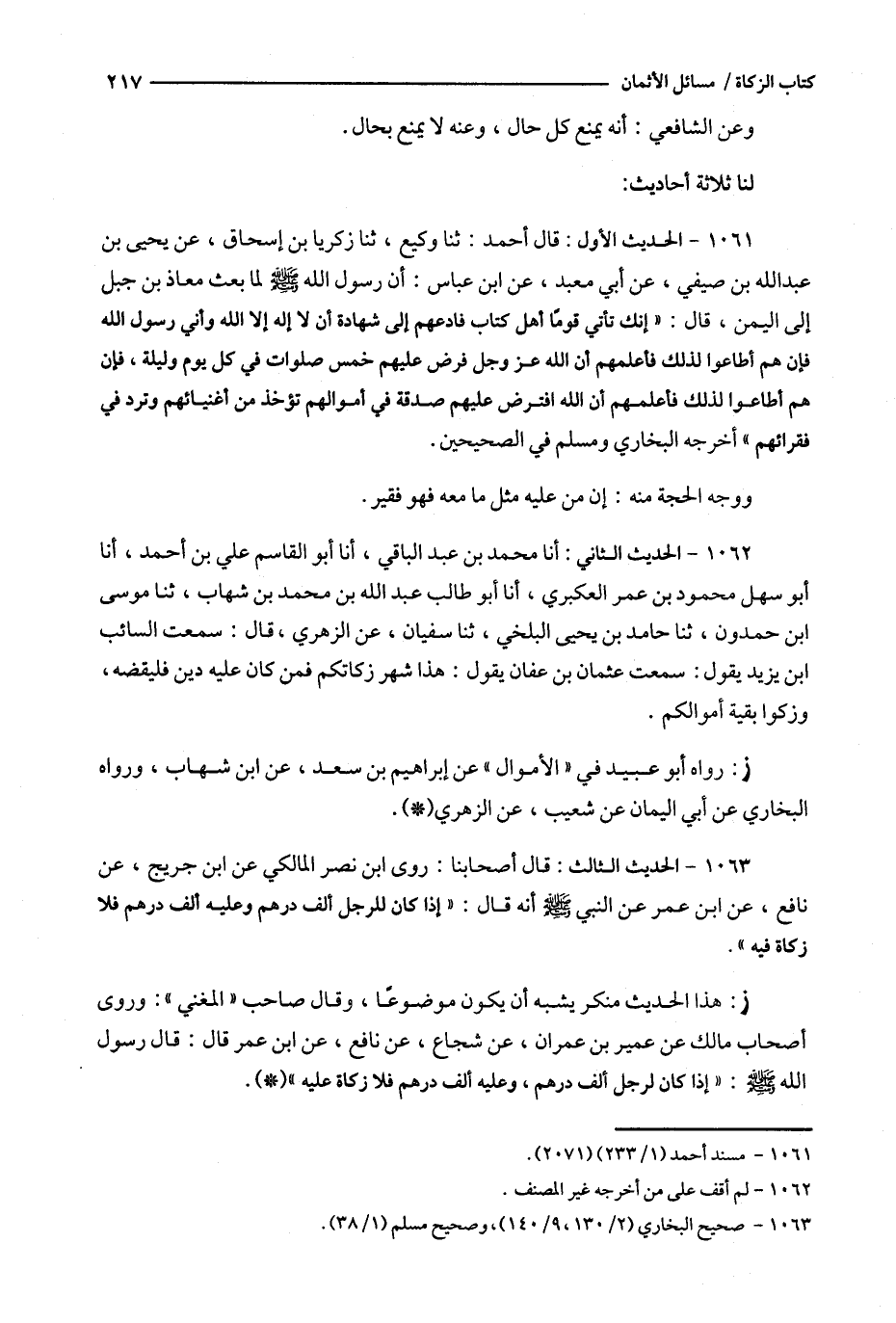 1061 - الحديث الأول : قال أحمد : ثنا وكيع ، ثنا زكريا بن إسحاق ، عن يحي بن عبد الله بن صيفي ، عن أبي معبد ، عن ابن عباس : أن رسول الله لما بعث معاذ بن جبل إلى اليمن ، قال : ' إنك تأتي قوما أهل كتاب فادعهم إلى شهادة أن لا إله إلا الله وأني رسول الله فإن هم أطاعوا لذلك فأعلمهم أن الله عز وجل فرض عليهم خمس صلوات في كل يوم وليلة ، فإن هم أطاعوا لذلك فأعلمهم أن الله افترض عليهم صدقة في أموالهم تؤخذ من أغنيائهم وترد في فقرائهم ' أخرجه البخاري ومسلم في الصحيحين .