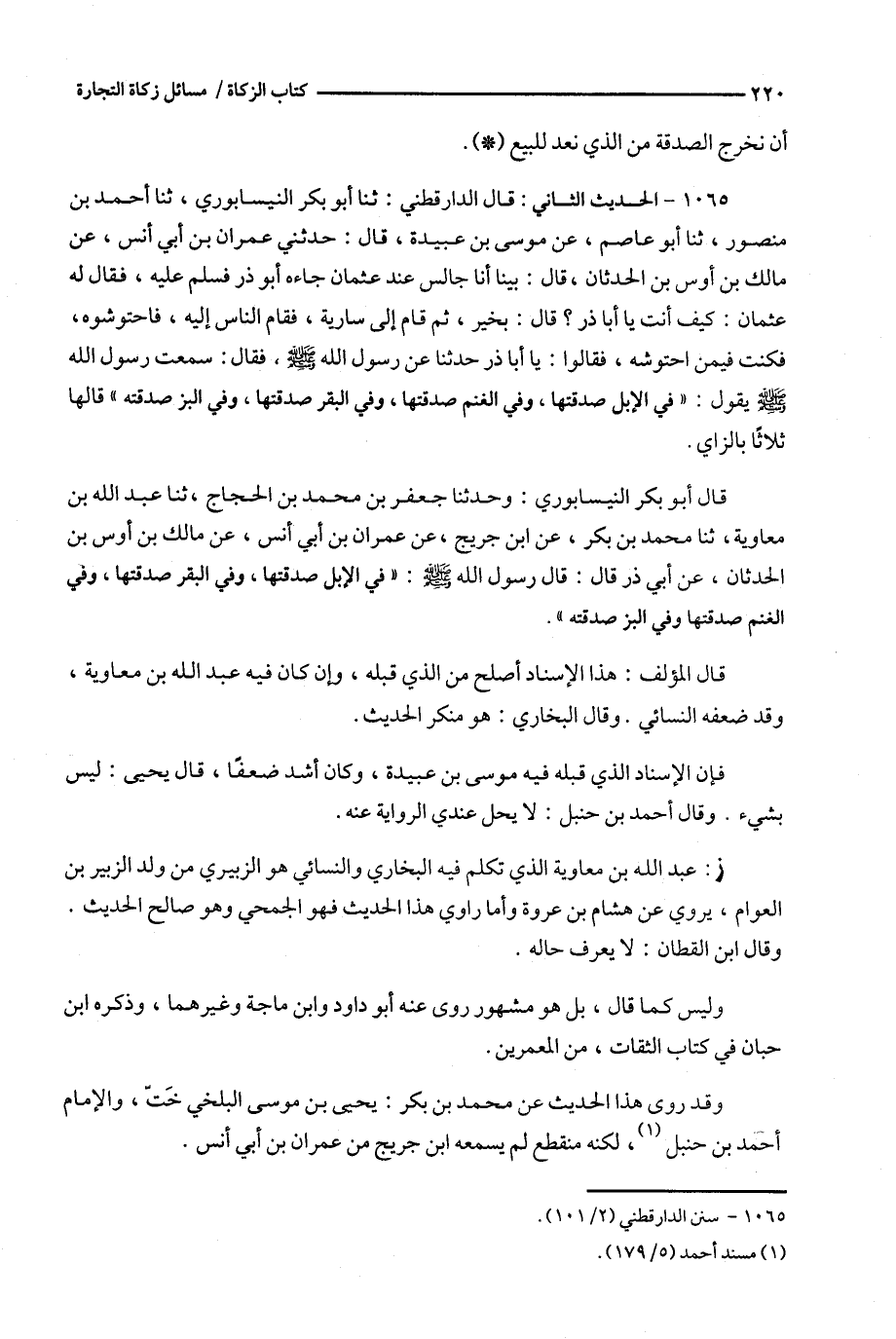 1065 - الحديث الثاني : قال الدارقطني : ثنا أبو بكر النيسابوري ، ثنا أحمد بن منصور ، ثنا أبو عاصم ، عن موسى بن عبيدة ، قال : حدثني عمران بن أبي أنس ، عن مالك بن أوس بن الحدثان ، قال : بينا أنا جالس عند عثمان جاءه أبو ذر فسلم عليه ، فقال له عثمان : كيف أنت يا أبا ذر ؟ قال : بخير ، ثم قام إلى سارية ، فقام الناس إليه ، فأحتوشوه ، فكنت فيمن احتوشه ، فقالوا : يا أبا ذر حدثنا عن رسول الله ، فقال : سمعت رسول الله يقول : ' في الإبل صدقتها ، وفي الغنم صدقتها ، وفي البقر صدقتها ، وفي البز صدقته ' قالها ثلاثا بالزاي .
