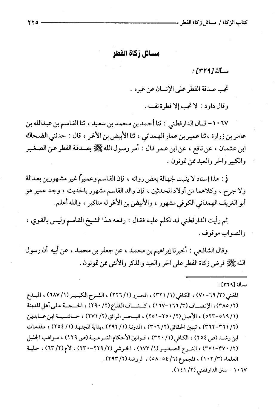 1067 - قال الدارقطني : ثنا أحمد بن محمد بن سعيد ، ثنا القاسم بن عبد الله بن عامر بن زرارة ، ثنا عمير بن عمار الهمداني ، ثنا الأبيض بن الأغر ، قال : حدثني الضحاك ابن عثمان ، عن نافع ، عن ابن عمر قال : أمر رسول الله بصدقة الفطر عن الصغير والكبير والحر والعبد ممن تمونون .
