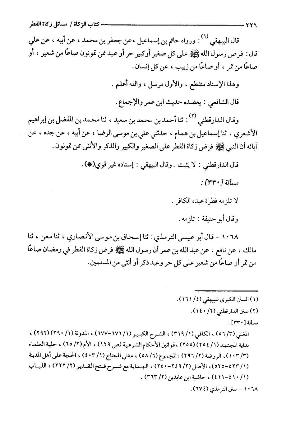 وقال الدارقطني : ثنا أحمد بن محمد بن سعيد ، ثنا محمد بن المفضل بن إبراهيم الأشعري ، ثنا إسماعيل بن همام ، حدثني علي بن موسى الرضا ، عن أبيه ، عن جده ، عن آبائه أن النبي فرض زكاة الفطر على الصغير والكبير والذكر والأنثى ممن تمونون .