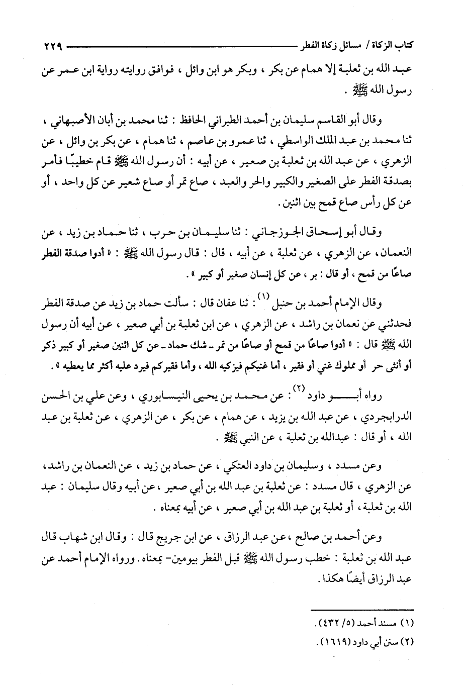 وقال الإمام أحمد بن حنبل : ثنا عفان قال : سألت حماد بن زيد عن صدقة الفطر فحدثني عن نعمان بن راشد ، عن الزهري ، عن ابن ثعلبة بن أبي صعير ، عن أبيه أن رسول الله قال : ' أدوا صاعا من قمح أو صاعا من تمر - شك حماد - عن كل اثنين صغير أو كبير ذكر أو أنثى حر أو مملوك غني أو فقير ، أما غنيكم فيزكيه الله ، وأما فقيركم فيرد عليه أكثر مما يعطيه ' .